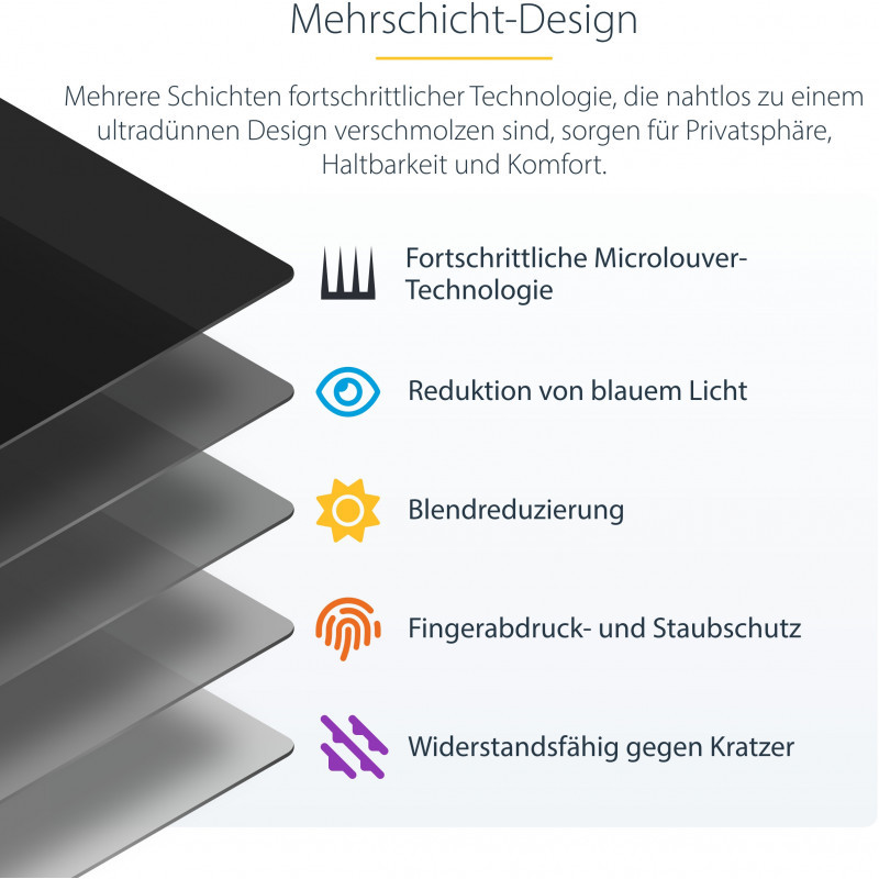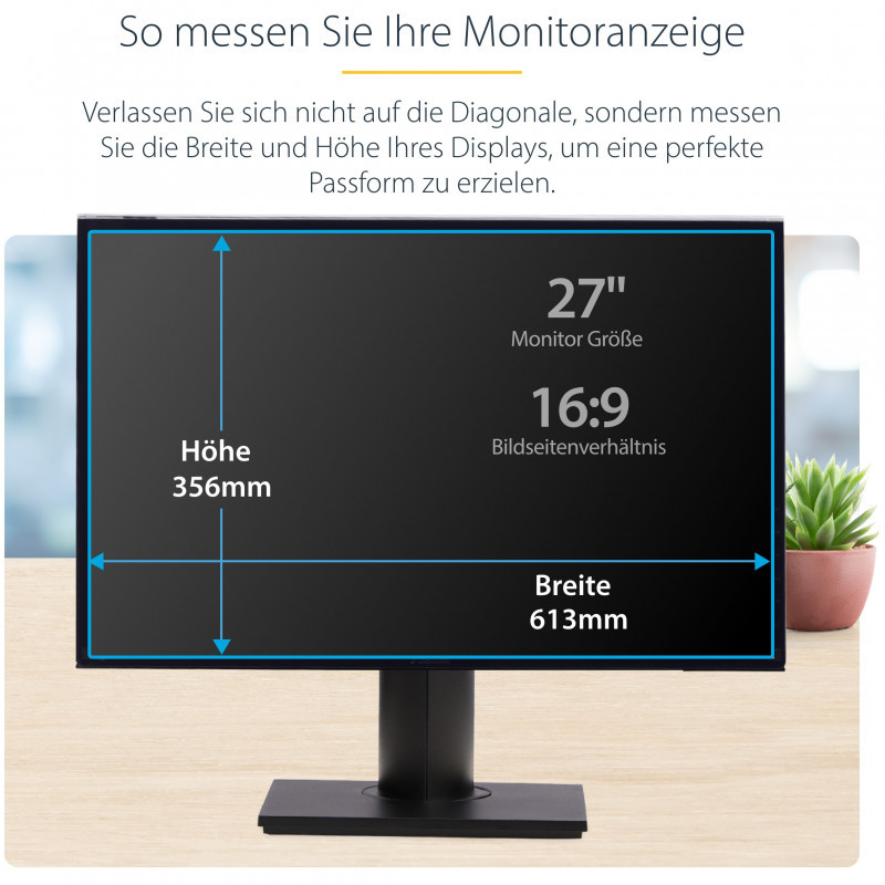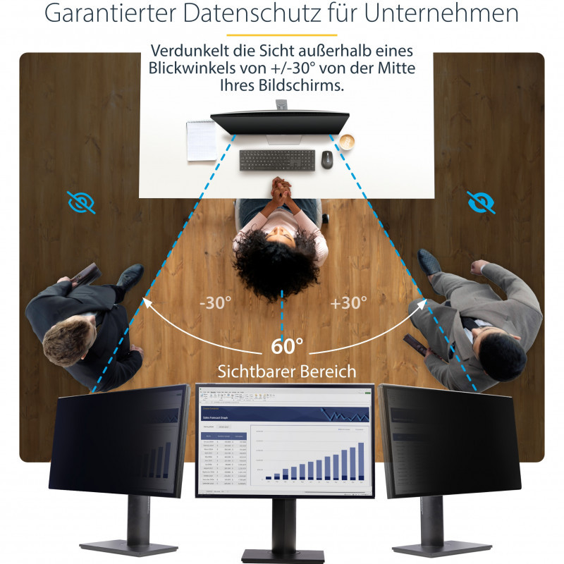 "StarTech.com 27-inch 16:9 Computer Monitor Privacy Screen, Hanging Acrylic Filter, Quick-Install Security Shield, Monitor Screen Protector, +/- 30 Deg. View, Glossy. Maximum screen size: 61 cm (24""), Suitable for: Monitor, Type: Frameless display privacy filter. Surface finish: Glossy, Protection features: Scratch resistant, Light transmission: 65%, Limits viewing angle: 30°. Weight: 700 g"\n"Prevent visual eavesdropping by limiting the viewing angle of a computer monitor screen