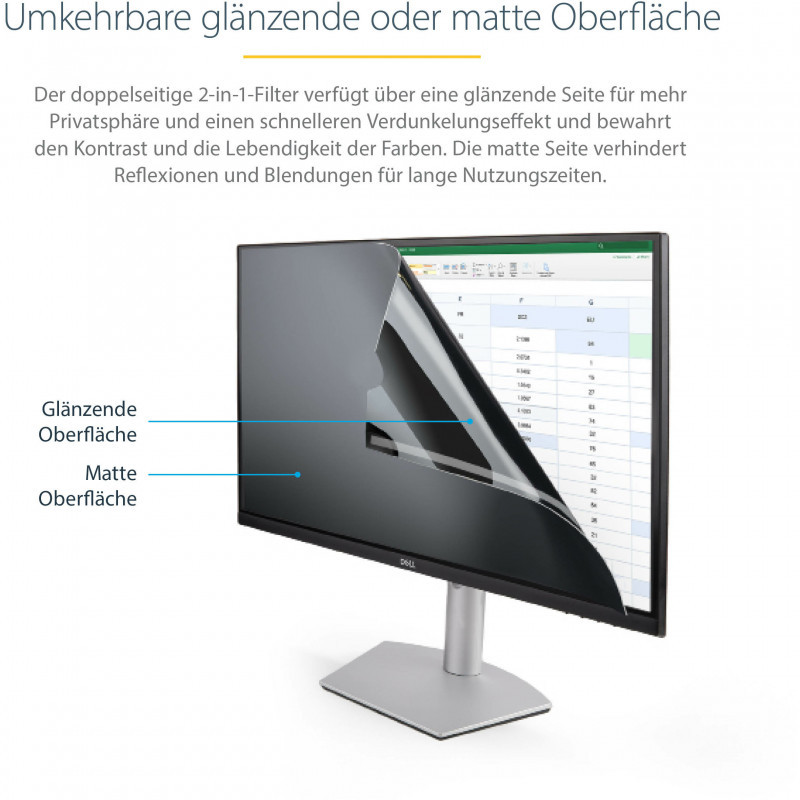 "StarTech.com Monitor Privacy Screen for 23.8"" Display - Computer Screen Security Filter - Blue Light Reducing Screen Protector Film - 16:9 Widescreen -Matte/Glossy - +/-30 Degree. Maximum screen size: 60.5 cm (23.8""). Aspect ratio: 16:9. Suitable for: Monitor, Type: Frameless display privacy filter. Limits viewing angle: 30°. Weight: 98 g"\n"Prevent visual eavesdropping by limiting the viewing angles of your computer monitor screen
