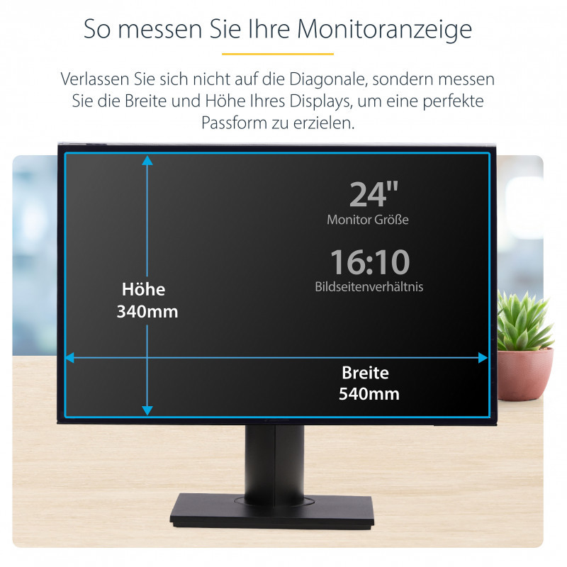 "StarTech.com 24-inch 16:10 Computer Monitor Privacy Screen, Hanging Acrylic Filter, Quick-Install Security Shield, Monitor Screen Protector, +/- 30 Deg. View, Glossy. Maximum screen size: 61 cm (24""). Aspect ratio: 16:10. Suitable for: Monitor, Type: Frameless display privacy filter. Surface finish: Glossy, Protection features: Scratch resistant, Light transmission: 65%, Limits viewing angle: 30°. Weight: 600 g"\n"Prevent visual eavesdropping by limiting the viewing angle of a computer monitor screen