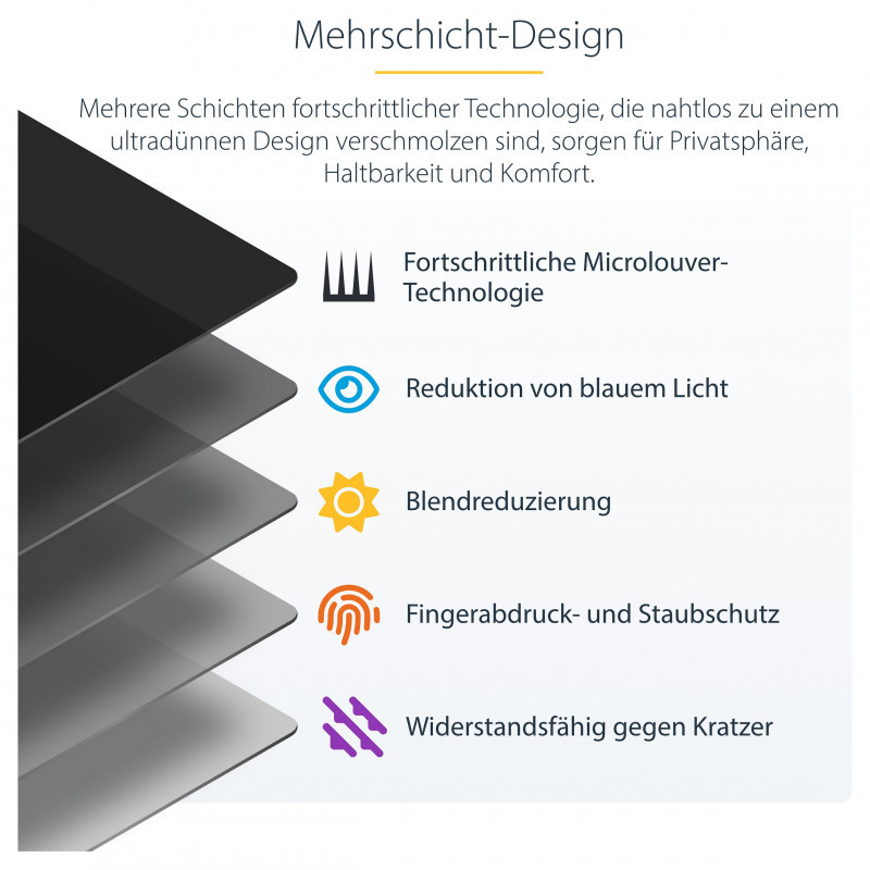 "StarTech.com 24-inch 16:9 Computer Monitor Privacy Screen, Hanging Acrylic Filter, Quick-Install Security Shield, Monitor Screen Protector, +/- 30 Deg. View, Glossy. Maximum screen size: 61 cm (24""). Aspect ratio: 16:9. Suitable for: Monitor, Type: Frameless display privacy filter. Surface finish: Glossy, Protection features: Scratch resistant, Light transmission: 65%, Limits viewing angle: 30°. Weight: 600 g"\n"Prevent visual eavesdropping by limiting the viewing angle of a computer monitor screen
