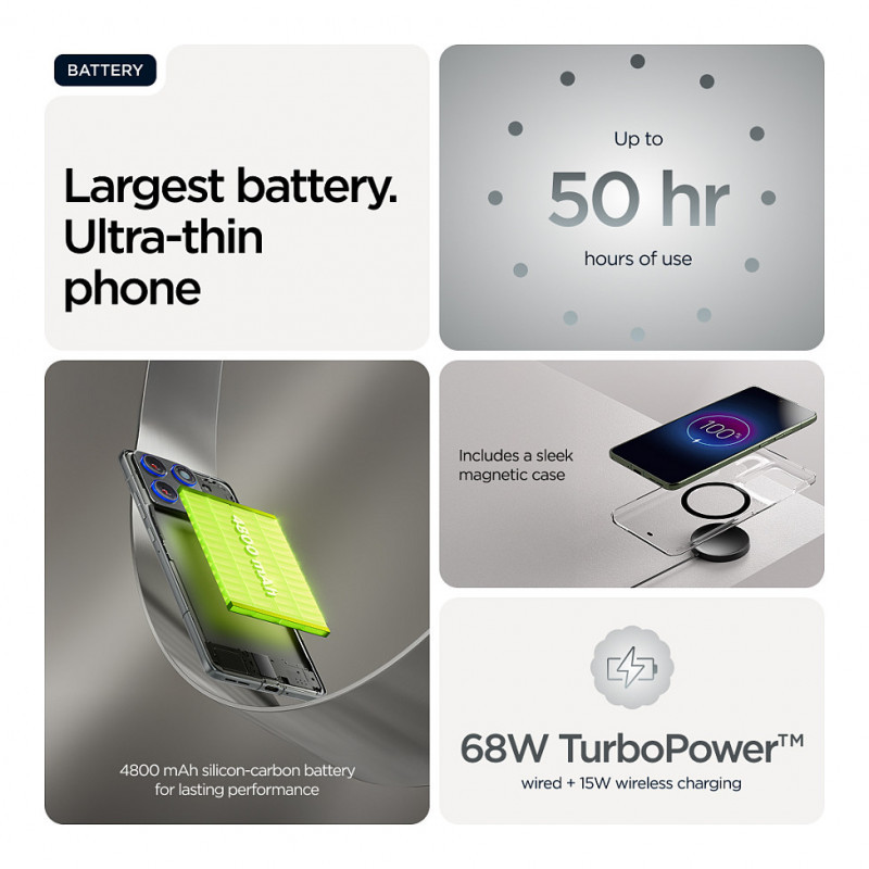 Introducing the all-new, impossibly thin motorola edge 70. Thoughtfully crafted from aircraft-grade aluminum with distinctive finishes and Pantone® colors, it reimagines what an ultrathin phone can do. The three 50MP lenses, the power of moto ai, and Pantone™ Validated color and skin tones, you get stunning results with every shot.(1) And a new silicon-carbon battery fuels your everyday adventures—without compromising the sleek design. Don’t let the elegance fool you. This phone is built to last. Rely on underwater protection and military-grade durability.(2, 3) View everything in breathtaking detail on a 6.7"" Super HD (1220p / 1.5K) display. And enjoy powerful Snapdragon® 7 Gen 4 performance along with tons of storage. Defy expectations with the motorola edge 70."
