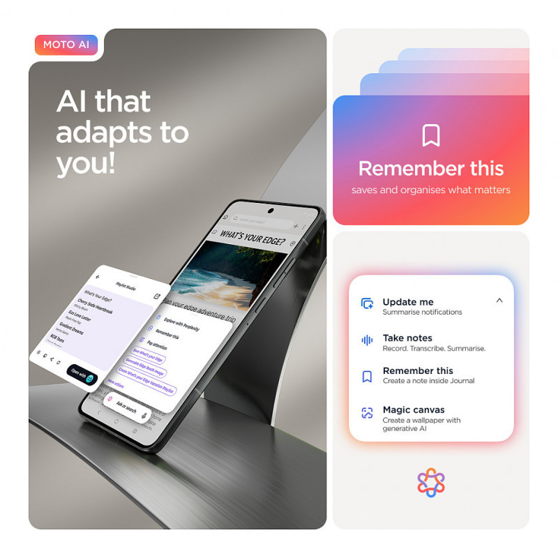 "Motorola edge 70 . Display diagonal: 17 cm (6.7""), Display resolution: 2712 x 1220 pixels. Processor family: Snapdragon, Processor model: 7 Gen 4. RAM capacity: 8 GB, RAM type: LPDDR5X, Internal storage capacity: 256 GB. Rear camera resolution (numeric): 50 MP, Rear camera type: Dual camera. SIM card capability: Dual SIM. Operating system installed: Android 16.0. Battery capacity: 4800 mAh. Product colour: Grey. Weight: 159 g"\n"What’s your edge?