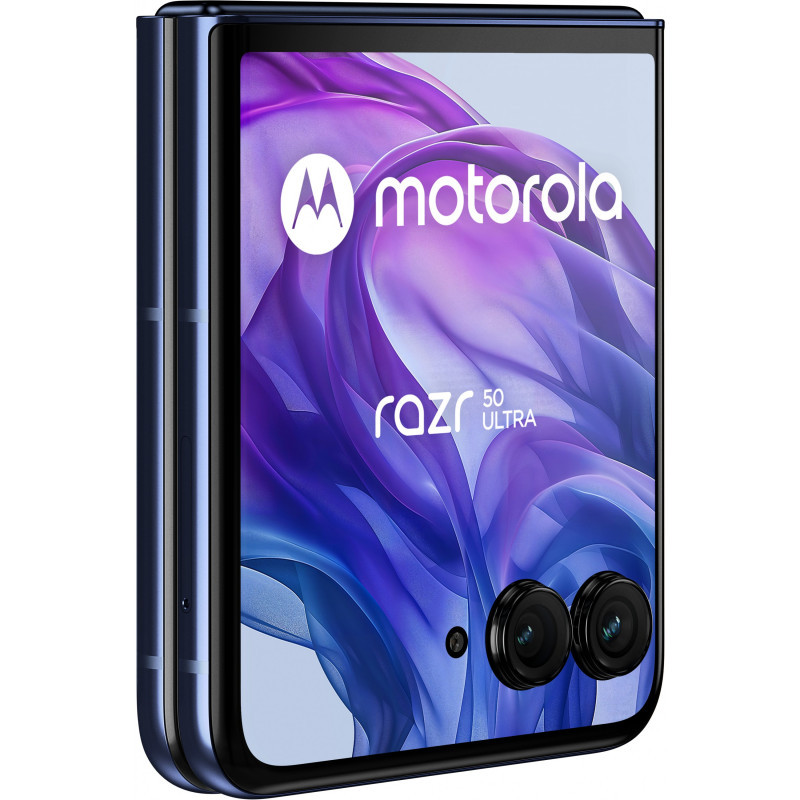 "Motorola razr 50 Ultra. Display diagonal: 17.5 cm (6.9""), Display resolution: 2640 x 1080 pixels. Processor family: Qualcomm Snapdragon, Processor model: 8s Gen 3. RAM capacity: 12 GB, RAM type: LPDDR5X, Internal storage capacity: 512 GB. Rear camera resolution (numeric): 50 MP, Rear camera type: Dual camera. SIM card capability: Dual SIM. Operating system installed: Android 14. Battery capacity: 4000 mAh. Product colour: Navy. Weight: 189 g"\n"Flip the script