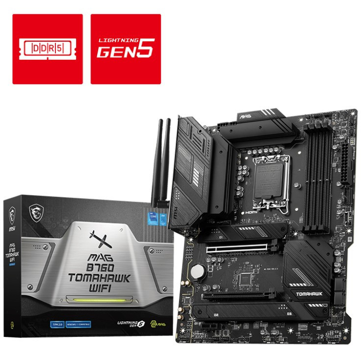 "MSI MAG B760 TOMAHAWK WIFI. Processor manufacturer: Intel, Processor socket: LGA 1700, Compatible processor series: Intel® Celeron®, Intel® Pentium® Gold. Supported memory types: DDR5-SDRAM, Maximum internal memory: 128 GB, Memory slots type: DIMM. Supported storage drive interfaces: M.2, SATA III, RAID levels: 0, 1, 5, 10. Ethernet interface type: 2.5 Gigabit Ethernet, Top Wi-Fi standard: Wi-Fi 6E (802.11ax), Wi-Fi standards: 802.11a, 802.11b, 802.11g, Wi-Fi 4 (802.11n), Wi-Fi 5 (802.11ac), Wi-Fi 6 (802.11ax), Wi-Fi 6E.... Component for: PC, Motherboard form factor: ATX, Motherboard chipset family: Intel"\n"unite as one
