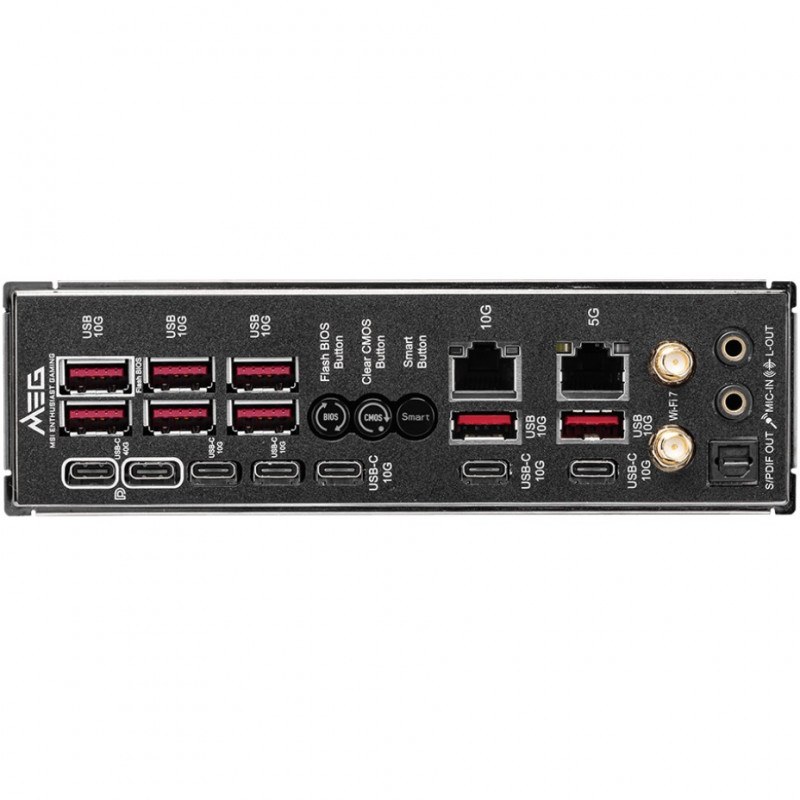 "MSI MEG X870E GODLIKE. Processor manufacturer: AMD, Processor socket: Socket AM5, Compatible processor series: AMD Ryzen 7000 Series, AMD Ryzen 8000 Series, AMD Ryzen 9000 Series. Supported memory types: DDR5-SDRAM, Maximum internal memory: 256 GB, Memory slots type: DIMM. Supported storage drive interfaces: M.2, SATA III, Supported storage drive types: HDD & SSD, RAID levels: 0, 1, 10. Ethernet interface type: 5 Gigabit Ethernet, Top Wi-Fi standard: Wi-Fi 7 (802.11be), Wi-Fi standards: 802.11a, 802.11b, 802.11g, Wi-Fi 4 (802.11n), Wi-Fi 5 (802.11ac), Wi-Fi 6 (802.11ax), Wi-Fi 6E.... Component for: PC, Motherboard form factor: Extended ATX, Motherboard chipset family: AMD"\n"Built for unparalleled performance on the AMD X870E chipset and Ryzen 9000 processors, the MEG X870E GODLIKE equips true Wi-Fi 7, 10G Super LAN, high-speed USB4, Supplemental PCIe Power, and the revolutionary Dynamic Dashboard III. Dominate tournaments and immerse in extreme gaming with the MEG X870E GODLIKE.