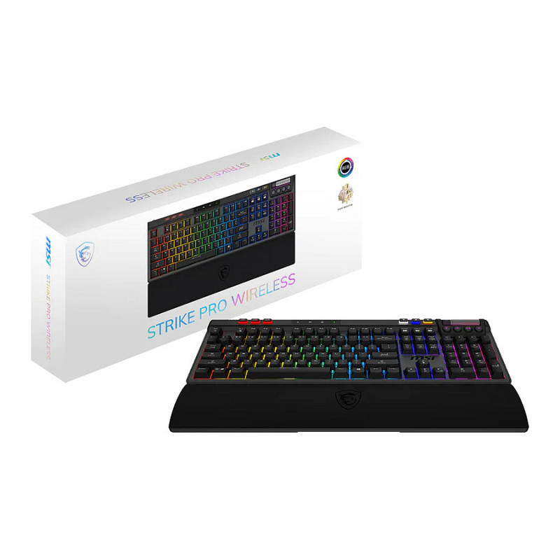 "MSI STRIKE PRO WIRELESS. Keyboard form factor: Full-size (100%). Keyboard style: Straight. Connectivity technology: Wireless, Device interface: USB + Bluetooth, Keyboard key switch: Mechanical, Keyboard layout: QWERTY. Backlight type: RGB LED. Cable length: 2 m. Recommended usage: Gaming. Product colour: Black"\n"The STRIKE PRO WIRELESS combines silent Kailh Midnight Pro switches, hot-swappable functionality, and tri-mode connectivity for versatile performance. With dye-sublimated PBT keycaps, per-key RGB lighting, and an ergonomic design featuring a memory foam wrist rest, it offers comfort and customization. The 4200mAh battery, smart scroll wheel, and included accessories make it the ultimate keyboard for work and play."