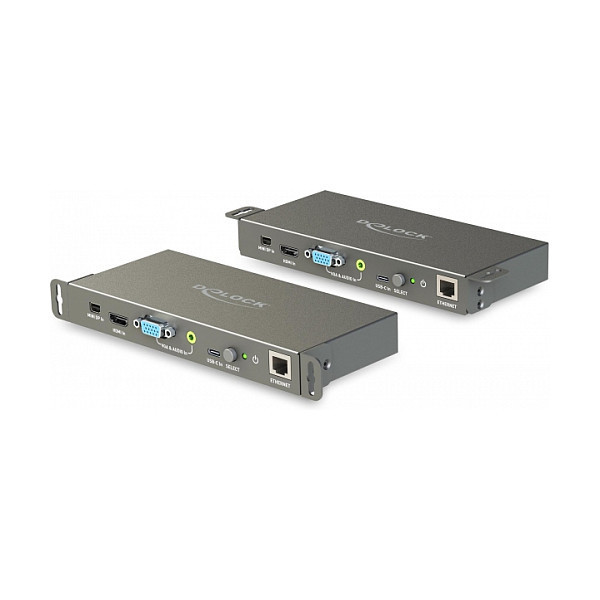 "DeLOCK 87732. Product colour: Black, Housing material: Metal. Maximum video resolution: 3840 x 2160 pixels, Video resolutions: 1920 x 1080,3840 x 2160 pixels. Output interface: HDMI/RJ-45. Input voltage: 100 - 240 V, Input frequency: 50 / 60 Hz, Operating voltage: 5 V. Width: 179 mm, Depth: 80 mm, Height: 25 mm"\n"This multi-functional converter by Delock makes it possible to convert different sources into one HDMI signal. The signal inputs are USB-C™ (DP Alt Mode), VGA with 3.5 mm audio, Mini DisplayPort and HDMI. The converter box is a practical solution for connecting various audio / video devices to a projector or TV with HDMI input."