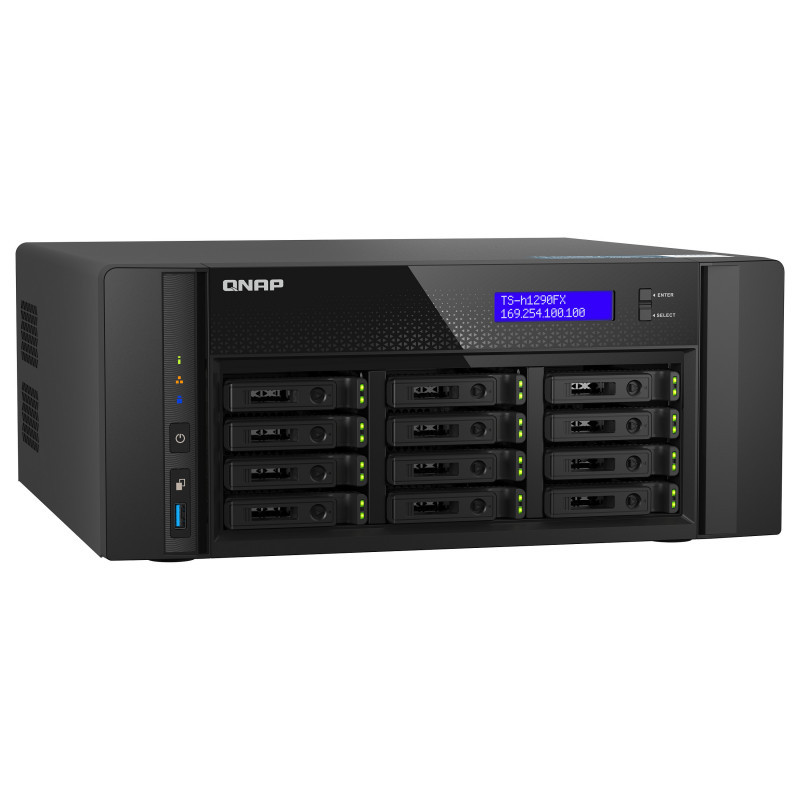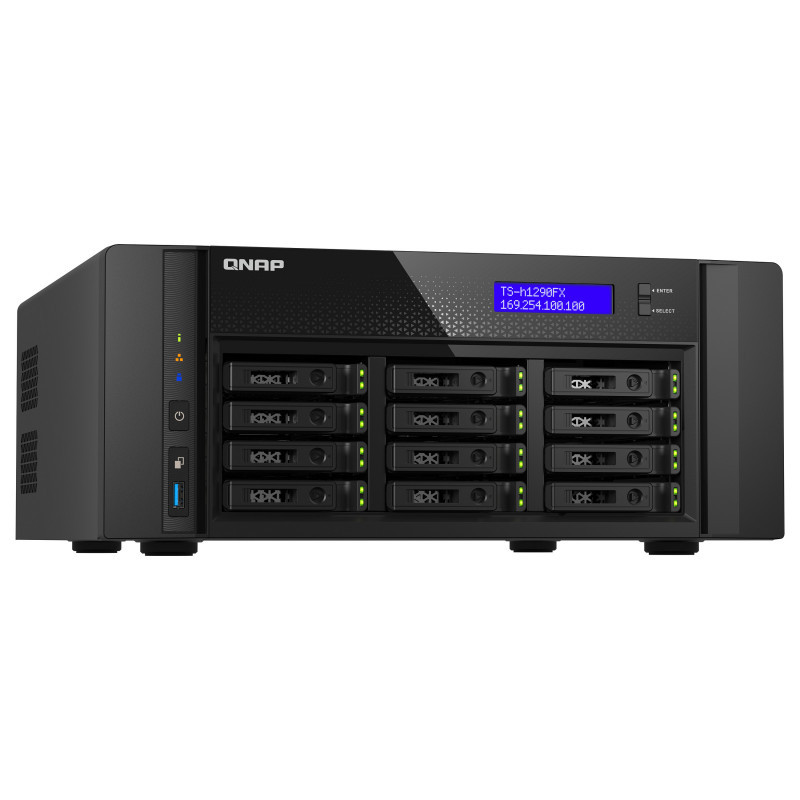 "QNAP TS-h1290FX. Type: NAS. Chassis type: Tower. Device class: Small & Medium Business. Processor family: EPYC, Processor model: 7302P, Processor frequency: 3 GHz. Internal memory: 128 GB, Internal memory type: DDR4. Total installed storage capacity: 0 TB. Operating system installed: QuTS hero"\n"Powerful 12-bay U.2 NVMe/ SATA all-flash NAS, featuring ZFS-based storage and 25GbE connectivity, ideal for office environments, collaborative 4K/8K video editing, and file sharing (Supports QuTS hero or QTS system)