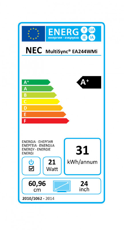 "NEC MultiSync EA244WMi. Display diagonal: 61 cm (24""), Display resolution: 1920 x 1200 pixels, Display technology: LED, Response time: 6 ms, Native aspect ratio: 16:10, Viewing angle, horizontal: 178°, Viewing angle, vertical: 178°. Built-in speaker(s). Built-in USB hub, USB hub version: 2.0. VESA mounting, Height adjustment. Product colour: White"\n"NEC MultiSync® EA244WMi features an extremely thin LED backlight panel with IPS technology which results in an ultra-modern and slim design in combination with a premium feature set for the corporate office use. Ambient Light and Human Sensors enforce the sustainable product concept while offering improved ergonomics with 130 mm height adjustability. Moreover the display offers broad connectivity with 4 inputs DisplayPort, HDMI, DVI-D and D-Sub. Thanks to its excellent IPS image quality with wide viewing angles in 16:10 screen format, it offers a high level of ergonomic comfort.