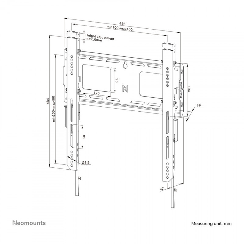 "Neomounts WL30-750BL14 Heavy duty wall mount 42-75"" - fixed - lockable - fast installation - TÜV. Maximum weight capacity: 100 kg, Minimum screen size: 106.7 cm (42""), Maximum screen size: 190.5 cm (75""), Minimum VESA mount: 100 x 100 mm, Maximum VESA mount: 400 x 400 mm. Height adjustment range: 0 - 10 mm, Distance to the wall (max): 4.2 cm. Product colour: Black"\n"The Neomounts WL30-750BL14 LEVEL is the ultimate solution for securely mounting an interactive or heavy weight display up to 75"" with a maximum capacity of 100 kg. This heavy-duty wall mount features a high profile wall plate and is engineered for stability and precision, ensuring your screen is securely mounted even on uneven surfaces. The wall mount is designed to provide the sturdiest and most stable touch screen experience. The brackets of the WL30-750BL14 feature depth adjustable wall supports on the lower brackets for better weight distribution and maximum stability. The mount features individual adjustable brackets (10 mm) for securely adjusting the display height or levelling it.