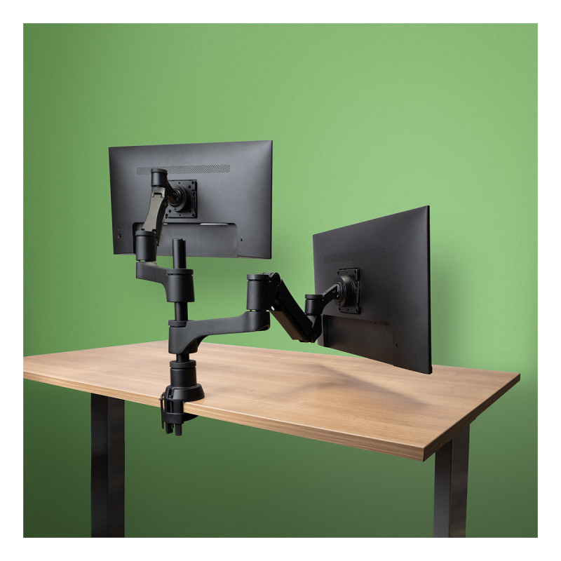 "Neomounts NM-D775DX3BLACK Monitor arm 17-27"" - gas spring - Topfix - 180°-stop. Mounting: Clamp/Grommet, Maximum weight capacity: 6 kg, Minimum screen size: 43.2 cm (17""), Maximum screen size: 68.6 cm (27""), Minimum VESA mount: 75 x 75 mm, Maximum VESA mount: 100 x 100 mm. Height adjustment, Swivel angle range: 0 - 360°, Tilt angle range: 0 - 20°. Product colour: Black"\n"The Neomounts NM-D775DX3BLACK is a tilt-, swivel and rotatable desk mount with crossbar and handle for three flat screens up to 27"". This mount is a great choice for space saving placement on desks using a desk clamp or grommet mount.