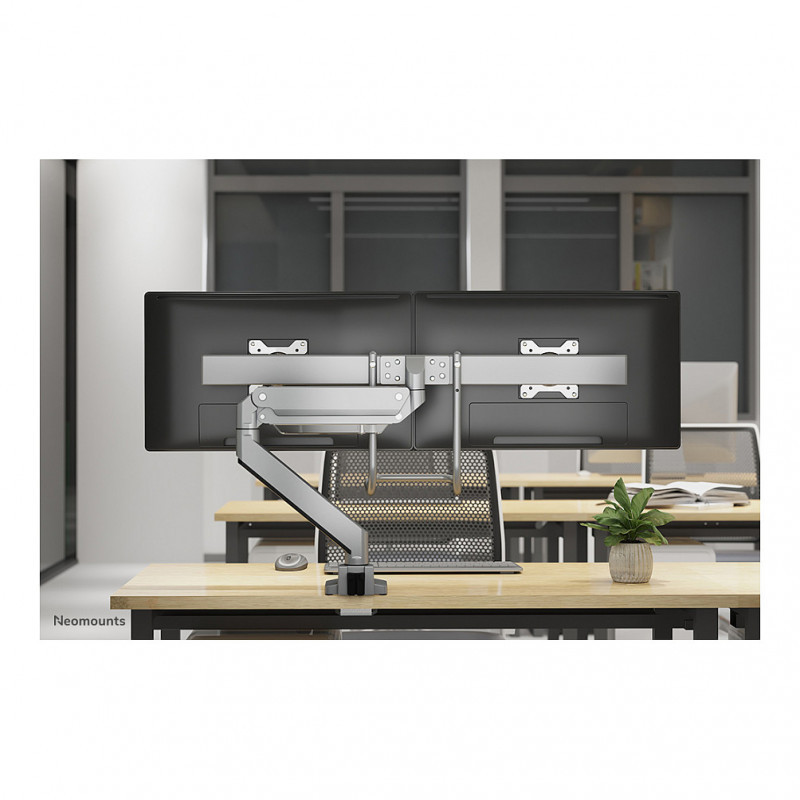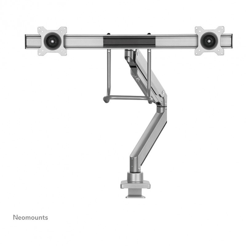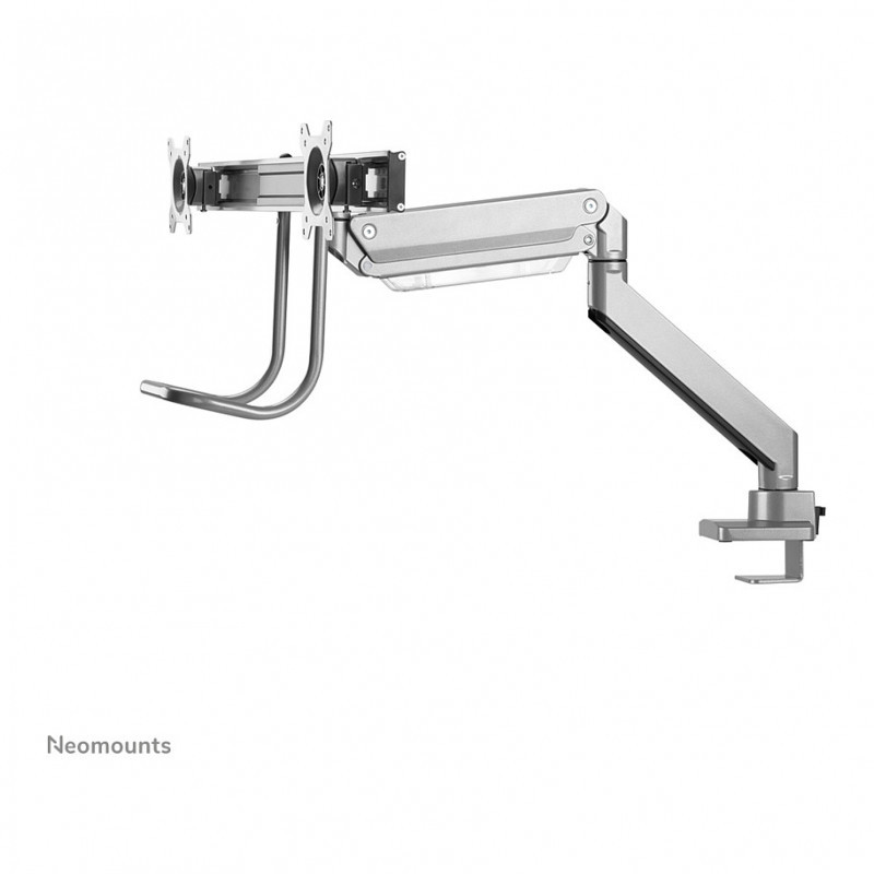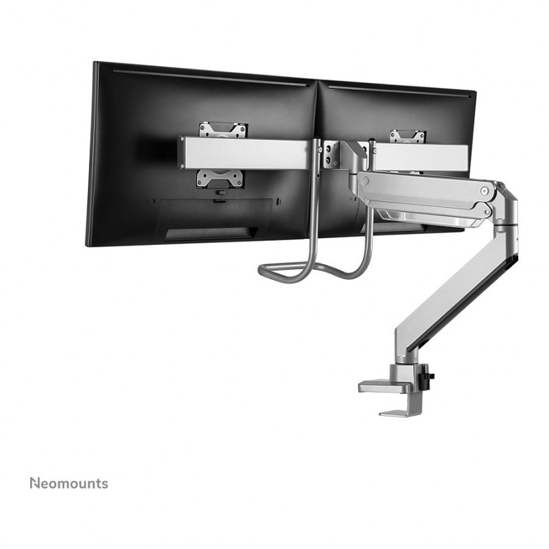"Neomounts NM-D775DXSILVER Monitor arm 10-32"" - gas spring - Topfix - 180°-stop. Mounting: Clamp/Grommet, Maximum weight capacity: 8 kg, Minimum screen size: 25.4 cm (10""), Maximum screen size: 81.3 cm (32""), Minimum VESA mount: 75 x 75 mm, Maximum VESA mount: 100 x 100 mm. Height adjustment, Swivel angle range: -90 - 90°, Tilt angle range: -10 - 10°. Product colour: Silver"\n"The Neomounts NM-D775DXSILVER is a tilt-, swivel and rotatable desk mount with crossbar and handle for 2 flat screens up to 32"". This mount is a great choice for space saving placement on desks using a desk clamp or grommet mount.