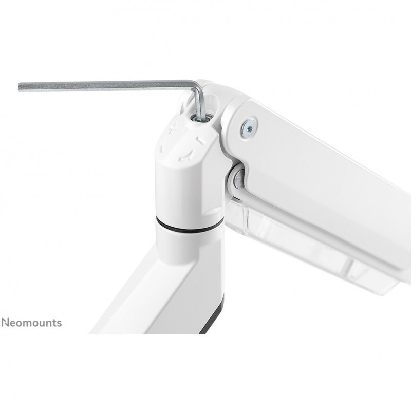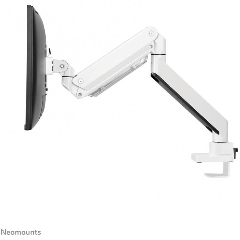 "Neomounts NM-D775WHITEPLUS Monitor arm 10-49"" - gas spring - Topfix - 180°-stop. Mounting: Clamp/Grommet, Maximum weight capacity: 18 kg, Minimum screen size: 25.4 cm (10""), Maximum screen size: 124.5 cm (49""), Minimum VESA mount: 75 x 75 mm, Maximum VESA mount: 100 x 100 mm. Height adjustment, Tilt angle range: -45 - 45°. Product colour: White"\n"The Neomounts NM-D775WHITEPLUS is a tilt-, swivel and rotatable desk mount for curved screens up to 49"". This mount is a great choice for space saving placement on desks using a top-fix desk clamp or grommet mount.