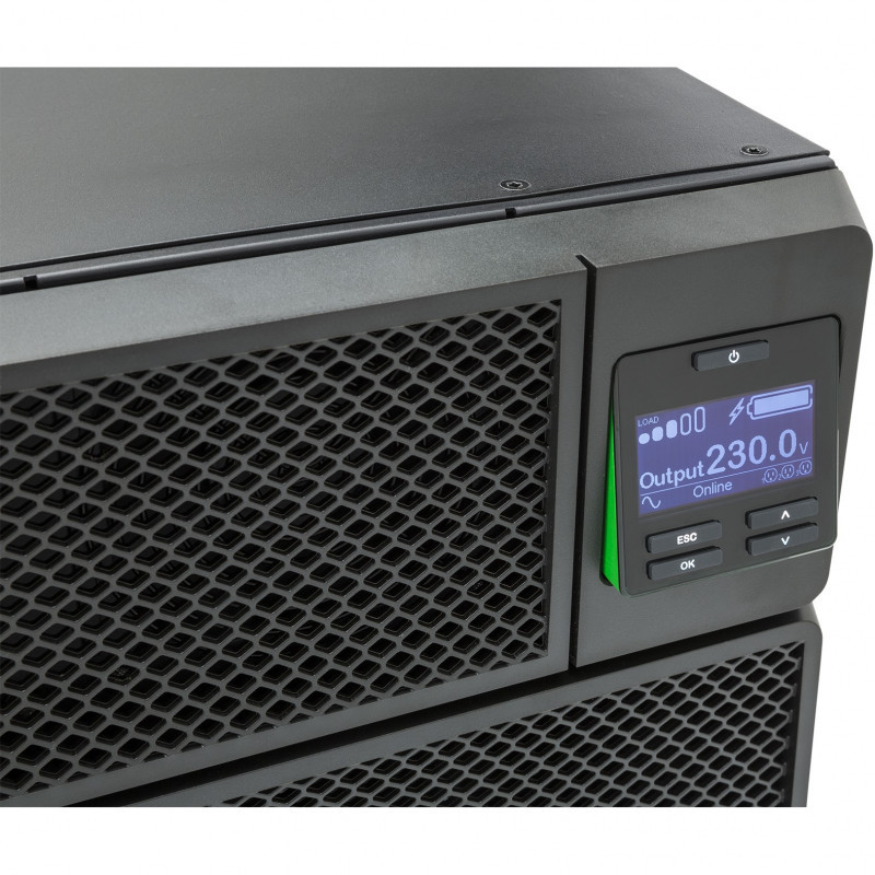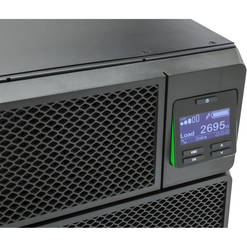 "APC Smart-UPS On-Line SRT5KRMXLI - 5000VA, 6x C13, 4x C19 output, rack mountable, Embedded NMC. UPS topology: Double-conversion (Online), Output power capacity: 5 kVA, Output power: 4500 W. AC outlet types: C13 coupler, C19 coupler, Power plug: Hardwire, AC outlets quantity: 10 AC outlet(s). Battery technology: Sealed Lead Acid (VRLA), Battery capacity: 845 VAh, Typical backup time at full load: 4 min. Form factor: Rackmount, Product colour: Black, Rack capacity: 3U. Compliance certificates: RoHS, Certification: REACH, CE, CE Mark, EAC, EN/IEC 62040-1, EN/IEC 62040-2, IRAM, RCM, VDE"\n"Stay always online and prevent data loss