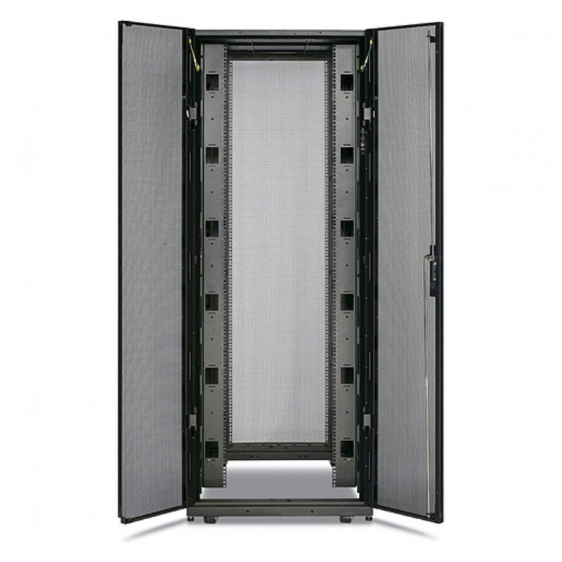 "APC NetShelter SX, Server Rack Enclosure, 42U, Black, 1991.4H x 750W x 1070D mm. Type: Freestanding rack, Rack capacity: 42U, Maximum weight capacity: 1701 kg, Key lock, Adjustable feet, Cable management, Castor wheels. Weight: 156 kg. Product colour: Black"\n"An industry standard server rack ready for medium to high density environments with height designed to easily fit through standard doorways. Wide rack design allows for additional space beside the vertical mounting rails for passing cabling from front-to-back in the enclosure. It provides plenty of clearance at the back for Rack PDUs and cable managers not to interfere with IT device hot swappable components. The width is ideal for converged and hyperconverged IT which include a mix of server, storage, and network switches all in one rack."