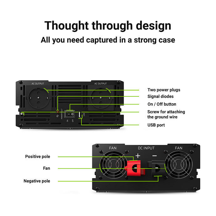 The whole was closed in a small,The whole was closed in a small, yet very durable casing. It is made of high quality aluminum, making it resistant to all mechanical damage and shock during travel. In addition, thanks to the materials used, the inverter is very light.