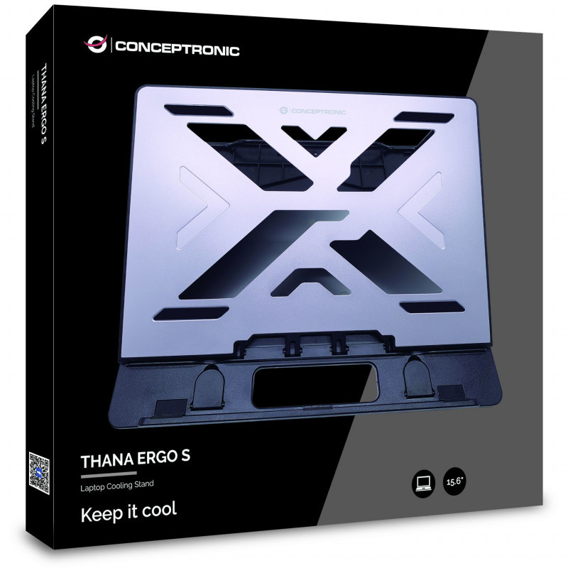 "Conceptronic THANA ERGO S, Laptop Cooling Stand. Product type: Laptop stand, Product colour: Grey, Maximum notebook screen size compatibility: 39.6 cm (15.6""). Width: 258 mm, Depth: 302 mm, Height: 24 mm. Package width: 258 mm, Package depth: 302 mm, Package height: 24 mm"\n"The Conceptronic ERGO cooling stand will maintain the safe and comfortable running of your portable device, featuring comfortable ergonomic design for use in any situation. Level height adjustment helps to maintain a correct sitting position while using the portable device, relieving pressure from the neck and shoulders. Features a hollow design for heat dissipation, effectively improving the air circulation rate and preventing the portable device from performance degradation caused by overheating. The cooling stand also features an anti-slip design to make sure the device remains centrally located on the stand. A handy and versatile addition to your mobile workstation, perfect for daily use."