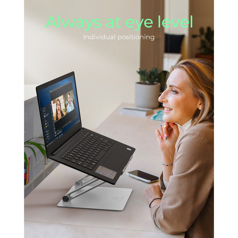 The IB-NH300’s smooth-running joints, which are arranged in two planes, allow the user to adjust the angle and height of the notebook ideally to suit personal needs. Two degrees of freedom of angle adjustment offer an enormous number of possibilities to achieve an ergonomic posture.