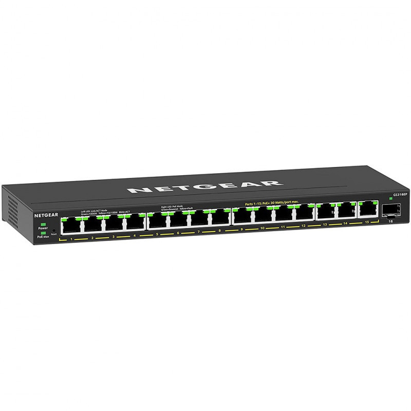 netPower 16P has 16 Gigabit Ethernet ports with PoE-out and two SFP+ ports for 10G fiber uplinks.
