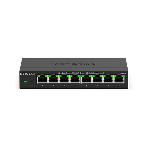 "NETGEAR MS308E. Switch type: Unmanaged. Basic switching RJ-45 Ethernet ports type: 2.5G Ethernet (100/1000/2500), Basic switching RJ-45 Ethernet ports quantity: 8. Full duplex. MAC address table: 16000 entries, Switching capacity: 40 Gbit/s. Networking standards: IEEE 802.1p, IEEE 802.3, IEEE 802.3ab, IEEE 802.3az, IEEE 802.3bz, IEEE 802.3u, IEEE 802.3x. DC input voltage: 12 V. Wall mountable"\n"NETGEAR 8-port 2.5G Multi-Gigabit Ethernet Plus Switch
