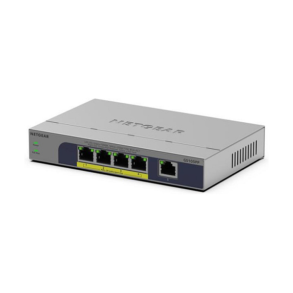 "NETGEAR GS105PP. Switch type: Unmanaged. Basic switching RJ-45 Ethernet ports type: Gigabit Ethernet (10/100/1000), Basic switching RJ-45 Ethernet ports quantity: 5. Full duplex. MAC address table: 2000 entries. Networking standards: IEEE 802.1p, IEEE 802.3af, IEEE 802.3at, IEEE 802.3az. DC input voltage: 54 V. Power over Ethernet (PoE). Form factor: Desktop/Wall-Mounting"\n"POWER-OVER-ETHERNET