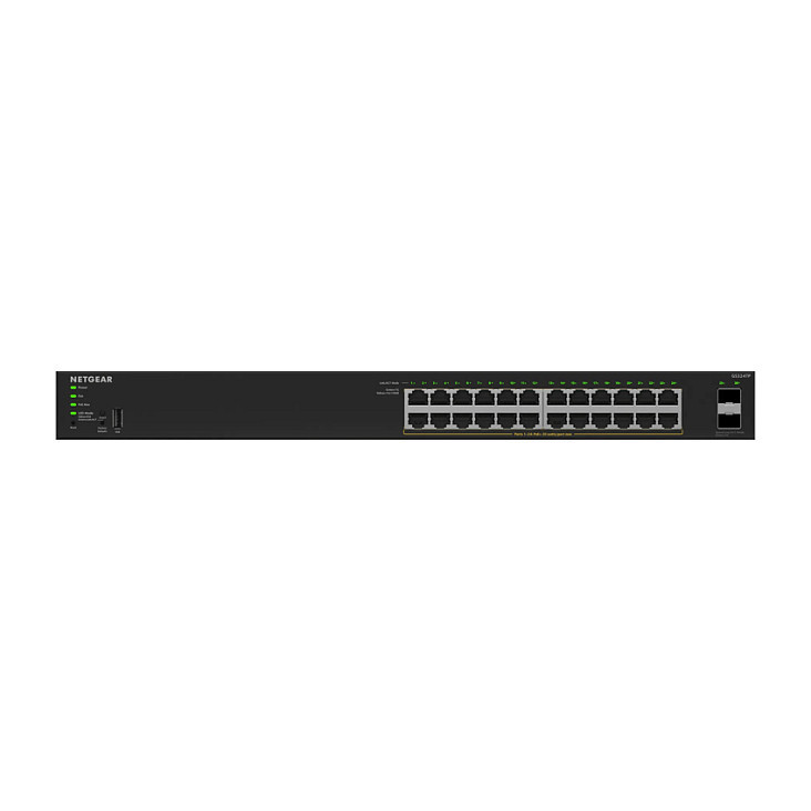 "NETGEAR GS324TPv2. Switch type: Managed, Switch layer: L2/L3. Basic switching RJ-45 Ethernet ports type: Gigabit Ethernet (10/100/1000), Basic switching RJ-45 Ethernet ports quantity: 24. Full duplex. MAC address table: 16000 entries, Switching capacity: 52 Gbit/s. Networking standards: IEEE 802.1D, IEEE 802.1Q, IEEE 802.1ab, IEEE 802.1p, IEEE 802.1s, IEEE 802.1w, IEEE 802.1x, IEEE.... Power over Ethernet (PoE). Rack mounting, Form factor: 1U"\n