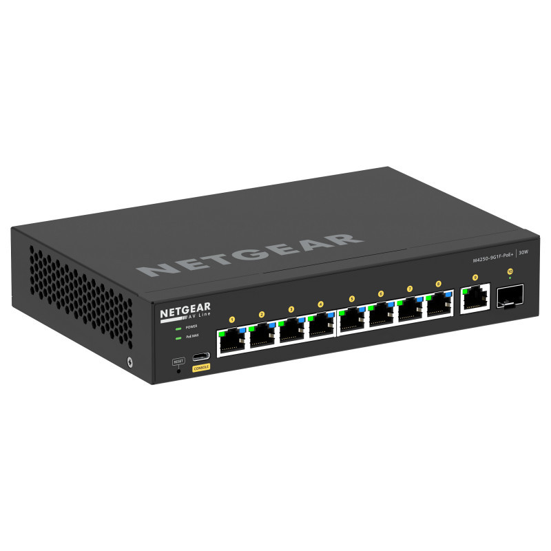 "NETGEAR 8x1G PoE+ 110W 1x1G and 1xSFP Managed Switch. Switch type: Managed, Switch layer: L2/L3. Basic switching RJ-45 Ethernet ports type: Gigabit Ethernet (10/100/1000), Basic switching RJ-45 Ethernet ports quantity: 8. Full duplex. MAC address table: 16000 entries, Switching capacity: 24 Gbit/s. Networking standards: IEEE 802.1D, IEEE 802.1Q, IEEE 802.1ab, IEEE 802.1s, IEEE 802.1w, IEEE 802.1x, IEEE 802.3ad, IEEE.... Power over Ethernet (PoE). Rack mounting"\n"Switching engineered for 1G AV over IP with versatile mounting options for under a table or behind a display. Pre-configured for out of the box functionality!