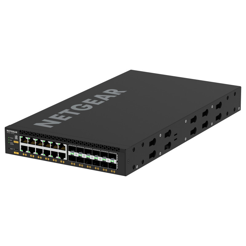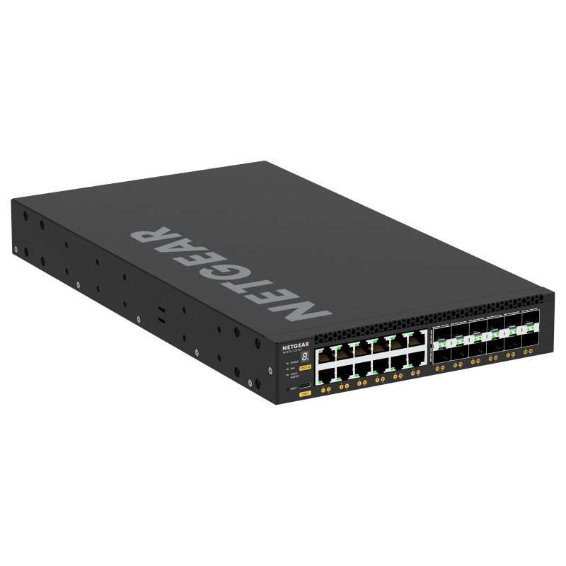 "NETGEAR M4350-12X12F. Switch type: Managed, Switch layer: L3. Basic switching RJ-45 Ethernet ports type: 10G Ethernet (100/1000/10000), Basic switching RJ-45 Ethernet ports quantity: 12. Full duplex. MAC address table: 16000 entries, Switching capacity: 480 Gbit/s. Networking standards: IEEE 802.1D, IEEE 802.1Q, IEEE 802.1Qav, IEEE 802.1s, IEEE 802.1w, IEEE 802.1x, IEEE 802.3, IEEE.... Power connector: AC-in jack. Rack mounting, Form factor: 1U"\n"POWER AND THROUGHPUT