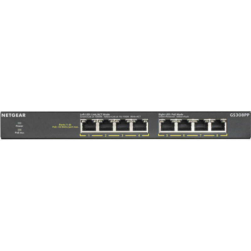 "NETGEAR GS108MX-100EUS. Switch type: Unmanaged, Switch layer: L2. Basic switching RJ-45 Ethernet ports type: Gigabit Ethernet (10/100/1000). Full duplex. MAC address table: 16000 entries, Switching capacity: 36 Gbit/s. Networking standards: IEEE 802.1p, IEEE 802.3az. DC input voltage: 12 V. Power connector: DC-in jack. Rack mounting, Form factor: Desktop/Wall-Mounting"\n"The NETGEAR 8-port Gigabit Unmanaged Switches, GS108X and GS108MX, help businesses cost-effectively connect their network with powerful gigabit speeds.