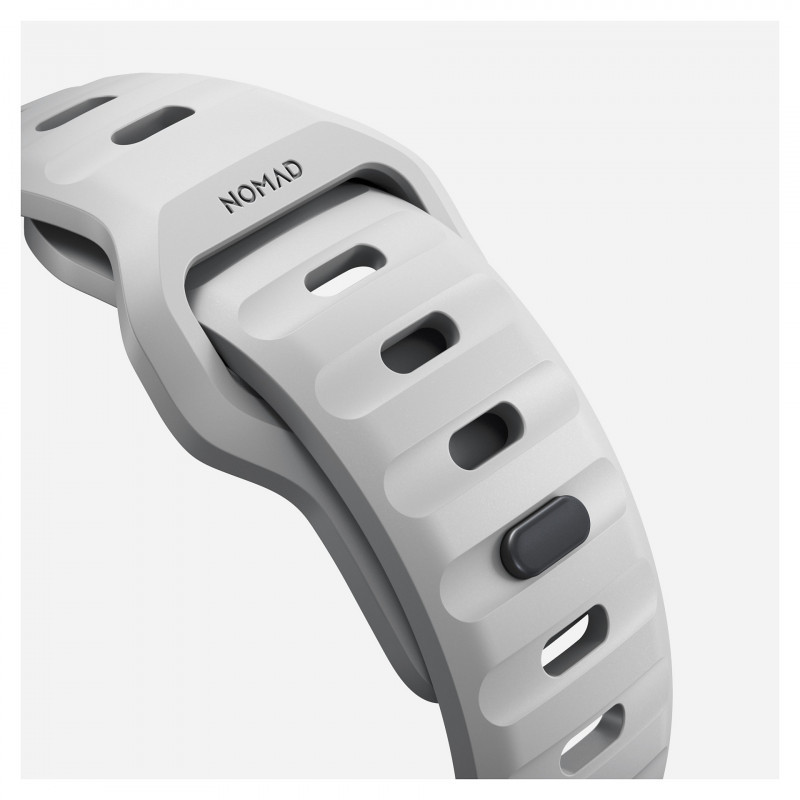 "Nomad 0856500019598. Watch part/accessory type: Watch strap, Brand compatibility: Apple, Compatibility: Apple Watch Series 7, 6, SE, and all previous versions of Apple Watch. Length: 41 mm, Width: 40 mm"\n"Designed to give your Apple Watch a modern and sleek, athletic look for intense workouts and everyday wear. Sport Band has a lightweight and breathable design which is constructed from a soft, flexible FKM rubber for all-day comfort. A low-profile pin-and-tuck mechanism ensures a secure closure.