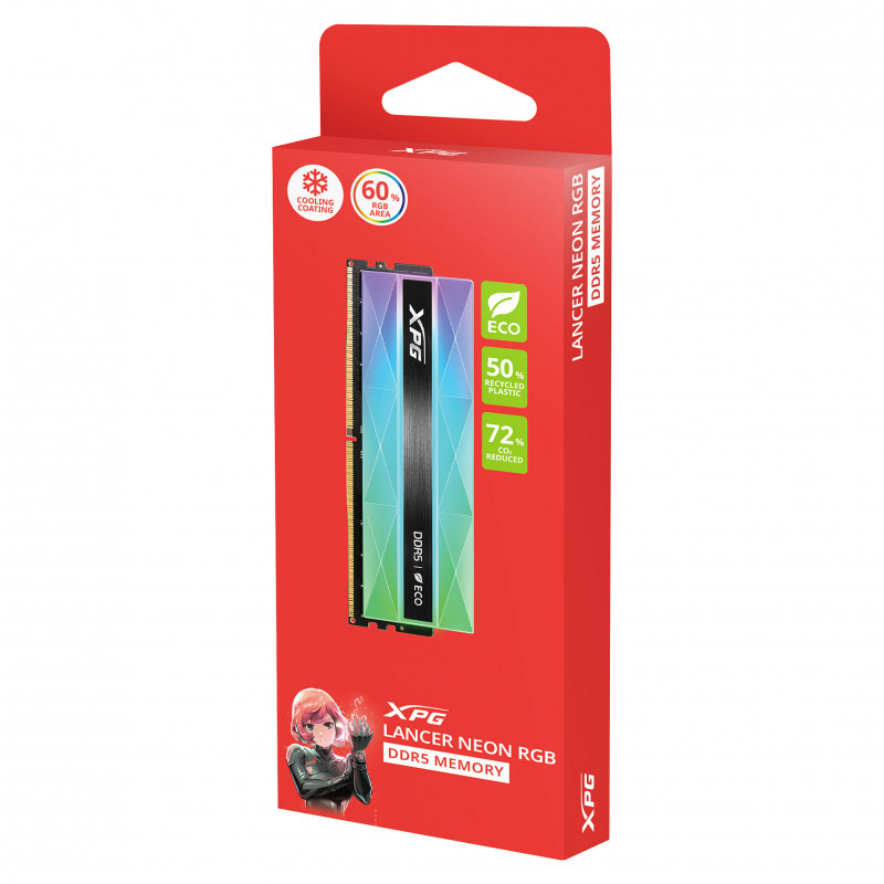 "XPG LANCER NEON RGB . Component for: PC, Internal memory: 16 GB, Memory layout (modules x size): 1 x 16 GB, Internal memory type: DDR5, Memory clock speed: 6400 MHz, Memory form factor: 288-pin DIMM, CAS latency: 32, ECC, Product colour: Multicolour"\n"World's 1st Eco-Friendly RGB DDR5 Memory Module