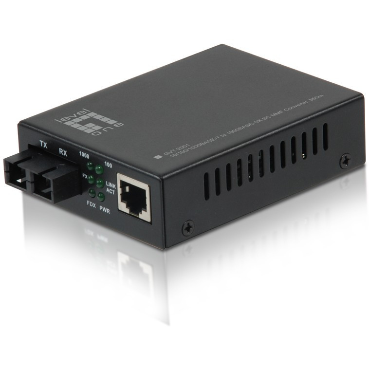 "LevelOne RJ45 to SC Gigabit Media Converter, Multi-Mode Fiber, 550m. Maximum data transfer rate: 1000 Mbit/s, Converter input interface: 10Base-T, 100Base-TX, 1000Base-T, Converter output interface: 1000Base-LX, 1000Base-SX. Maximum transfer distance: 550 m, Wavelength: 850 nm, Fiber mode structure: Multi-mode. LED indicators: Activity, Link, Power, Product colour: Black. Fiber optic connector: SC, Connectivity technology: Wired. Input voltage: 5 - 12 V, Input current: 2 A"\n"The GVT-2001 MMF SC media converter is able to convert network signals between copper and fiber-optic based networks. The converter provides a 10/100/1000Base-T RJ-45 port, supports full duplex and half duplex switch connectivity and 10Base-T, 100Base-TX and 1000Base-T auto-sensing. Used in multi-mode with fibre-optic cabling, this can extend a network range up to 550m.