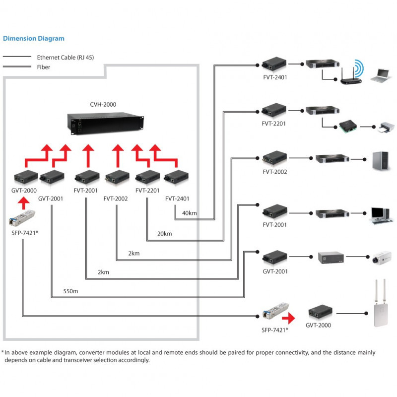 The GVT-2001 is able to operate in temperatures from -10° up to 55° Celsius. The converter can be used as a standalone unit or as a slide-in module to the CHV-2000 19” converter rack, which can accommodate up to 14 units for use in a central wiring closet."