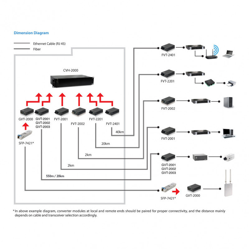 "LevelOne RJ45 to ST Gigabit Media Converter, Single-Mode Fiber, 1310nm, 20km. Maximum data transfer rate: 1000 Mbit/s, Converter input interface: 1000Base-LX, 1000Base-SX, Networking standards: IEEE 802.3, IEEE 802.3ab, IEEE 802.3u, IEEE 802.3z. Maximum transfer distance: 20000 m, Wavelength: 1310 nm, Fiber mode structure: Single-mode. LED indicators: Link, Power, Product colour: Black. Fiber optic connector: ST, Connectivity technology: Wired. Power consumption (typical): 5 W"\n"The GVT-2003 SMF ST media converter is able to convert network signals between copper and fiber-optic based networks. The converter provides a 10/100/1000Base-T RJ-45 port, supports full duplex and half duplex switch connectivity and 10Base-T, 100Base-TX and 1000Base-T auto-sensing. Used in single-mode with fibre-optic cabling, this can extend a network range up to 20km. The device features built-in Dip switches for easy converter configuration, which function on the Smart LFP (Link Fault Pass-through), allowing the converter to monitor both the fiber and copper ports for signal loss, as well as cut through and smart pass through mode. The GVT-2003 is able to operate in temperatures from -10° up to 55° Celsius. The converter can be used as a standalone unit or as a slide-in module to the CHV-2000 19” converter rack, which can accommodate up to 14 units for use in a central wiring closet."