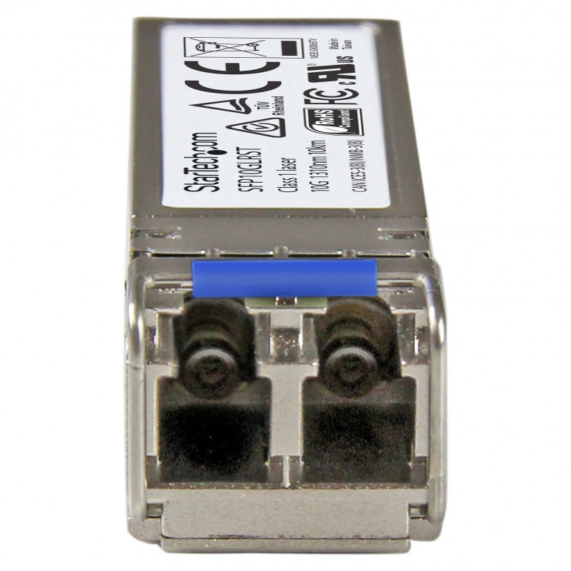 "StarTech.com Cisco SFP-10G-LR Compatible SFP+ Transceiver Module - 10GBASE-LR~Cisco SFP-10G-LR Compatible SFP+ Module - 10GBASE-LR - 10GbE Single Mode Fiber SMF Optic Transceiver - 10GE Gigabit Ethernet SFP+ - LC 10km - 1310nm - DDM Cisco Firepower, ASR9000, C9300. SFP transceiver type: Fiber optic, Maximum data transfer rate: 10000 Mbit/s, Interface type: SFP+. Product colour: Silver, Housing material: Zinc steel, Mean time between failures (MTBF): 2104865 h. Power consumption (typical): 1.3 W. Compliance certificates: RoHS, Certification: CE, FCC, UL. Width: 13.7 mm, Depth: 56.6 mm, Height: 12.5 mm"\n"10 Gbps | Single Mode Fiber | LC | 10 km (6.2 mi) | Lifetime Warranty