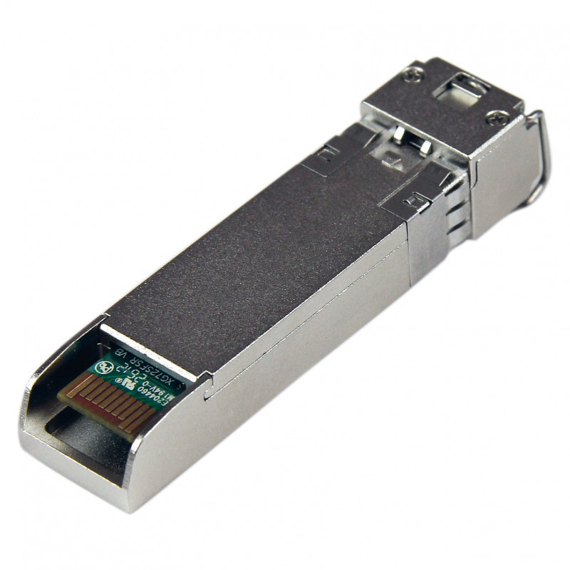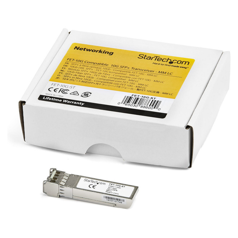 "StarTech.com Cisco FET-10G Compatible SFP+ Module - 10GBASE-USR - 10GbE Multimode Fiber MMF Optic Transceiver - 10GE Gigabit Ethernet SFP+ - LC 300m - 850nm - DDM Cisco Nexus 2000. SFP transceiver type: Fiber optic, Maximum data transfer rate: 10000 Mbit/s, Interface type: SFP+. Product colour: Silver, Mean time between failures (MTBF): 498745585 h, Brand compatibility: Cisco. Width: 58.4 mm, Depth: 13.9 mm, Height: 13.7 mm. Quantity per pack: 1 pc(s). Package width: 90 mm, Package depth: 115 mm, Package height: 31 mm"\n"10 Gbps | Multi Mode Fiber | LC | 100 m (328 ft) | Lifetime Warranty