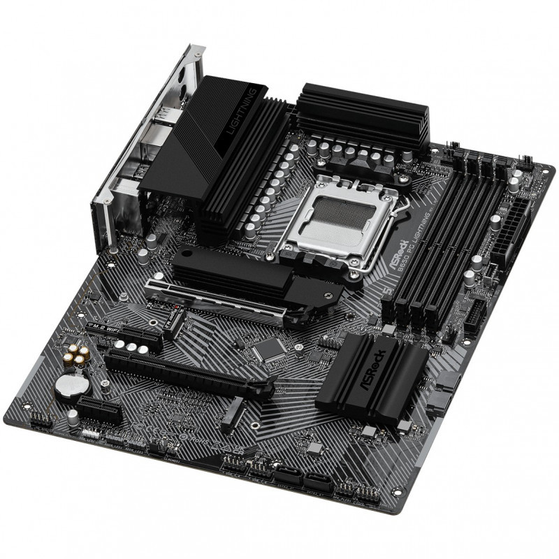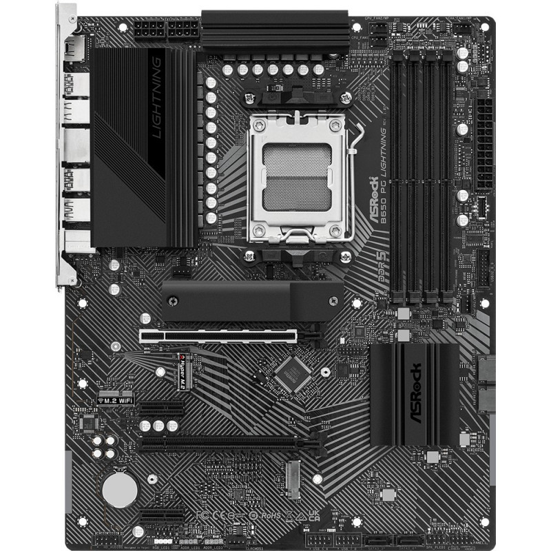 "Asrock B650 PG Lightning. Processor manufacturer: AMD, Processor socket: Socket AM5. Supported memory types: DDR5-SDRAM, Maximum internal memory: 128 GB, Memory slots type: DIMM. Supported storage drive interfaces: M.2, SATA II, Supported storage drive types: HDD & SSD, RAID levels: 0, 1, 10. Graphics card family: AMD, Graphics card: AMD RDNA 2. Ethernet interface type: 2.5 Gigabit Ethernet, LAN controller: Dragon RTL8125BG, Top Wi-Fi standard: Wi-Fi 6E (802.11ax)"\n