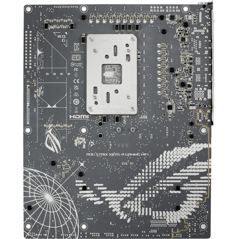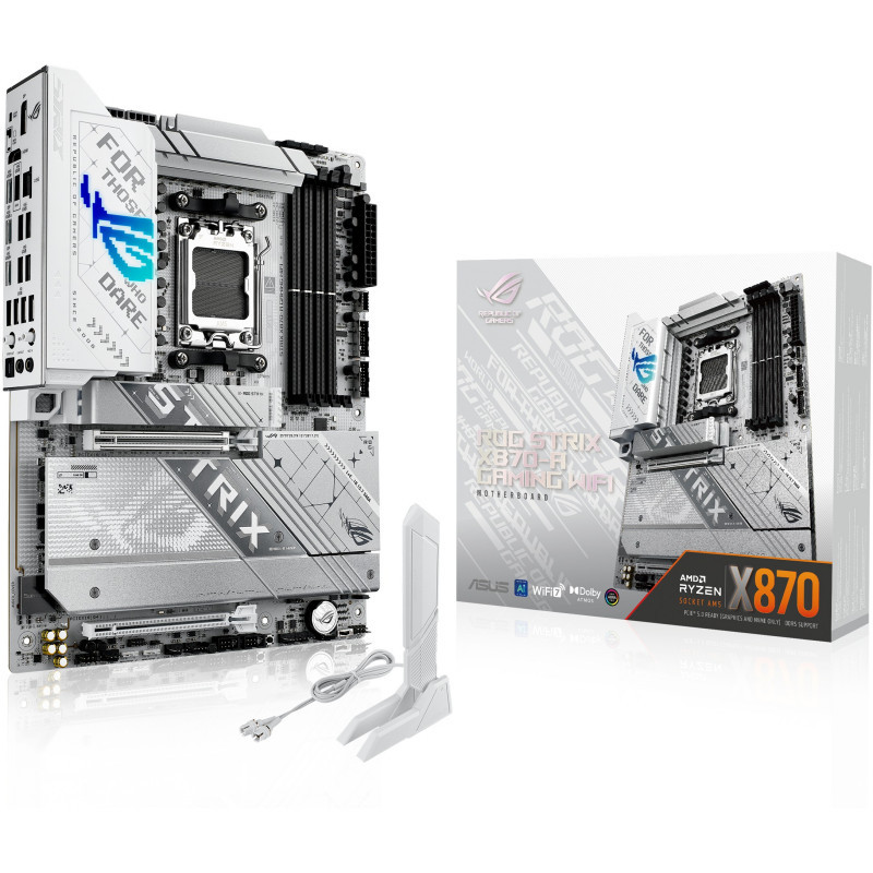 "ASUS ROG STRIX X870-A GAMING WIFI. Processor manufacturer: AMD, Processor socket: Socket AM5, Supported processor sockets: Socket AM5. Supported memory types: DDR5-SDRAM, Maximum internal memory: 192 GB, Memory slots type: DIMM. Supported storage drive interfaces: M.2, SATA III, Supported storage drive types: HDD & SSD, RAID levels: 0, 1, 10, 5. Ethernet interface type: 2.5 Gigabit Ethernet, Top Wi-Fi standard: Wi-Fi 7 (802.11be), Wi-Fi standards: Wi-Fi 7 (802.11be). Component for: PC, Motherboard form factor: ATX, Motherboard chipset family: AMD"\n"ASUS AI INTELLIGENCE