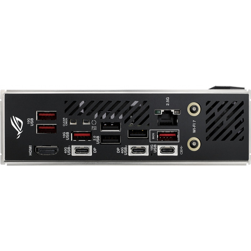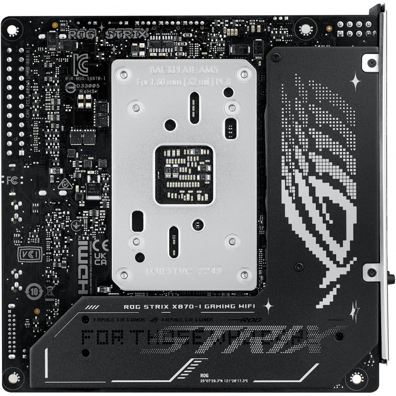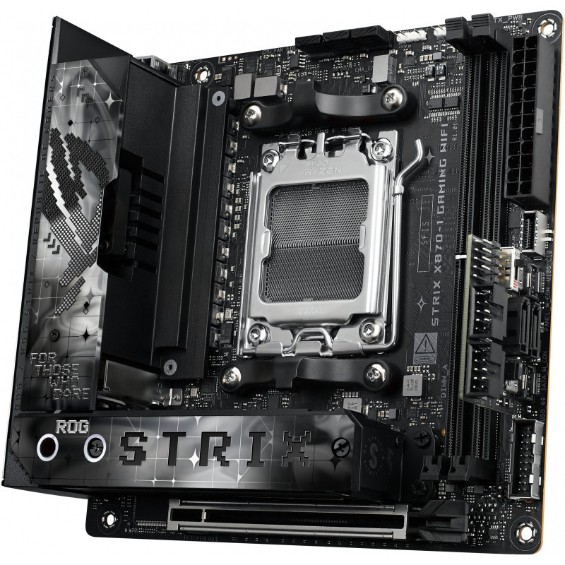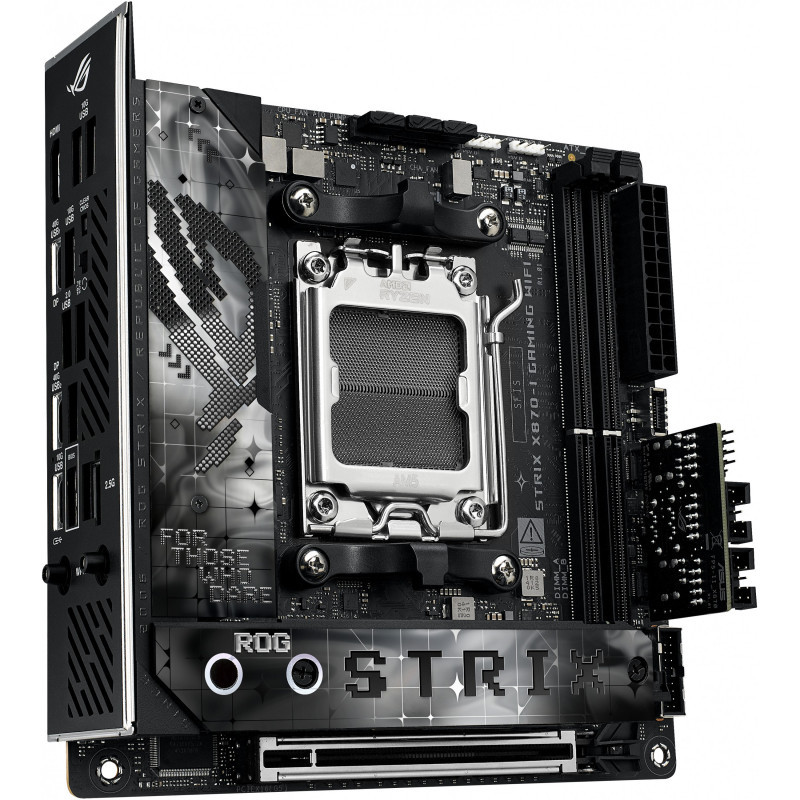 "ASUS ROG STRIX X870-I GAMING WIFI. Processor manufacturer: AMD, Processor socket: Socket AM5, Compatible processor series: AMD Ryzen 7000 Series, AMD Ryzen 8000 Series, AMD Ryzen 9000 Series. Supported memory types: DDR5-SDRAM, Maximum internal memory: 96 GB, Memory slots type: DIMM. Supported storage drive interfaces: M.2, SATA III, Supported storage drive types: HDD & SSD, RAID levels: 0, 1, 10. USB connector type: USB Type-A, USB Type-C. Ethernet interface type: 2.5 Gigabit Ethernet, Fast Ethernet, Gigabit Ethernet, Top Wi-Fi standard: Wi-Fi 7 (802.11be), Wi-Fi standards: Wi-Fi 7 (802.11be)"\n"ROG STRIX X870-I gaming wifi