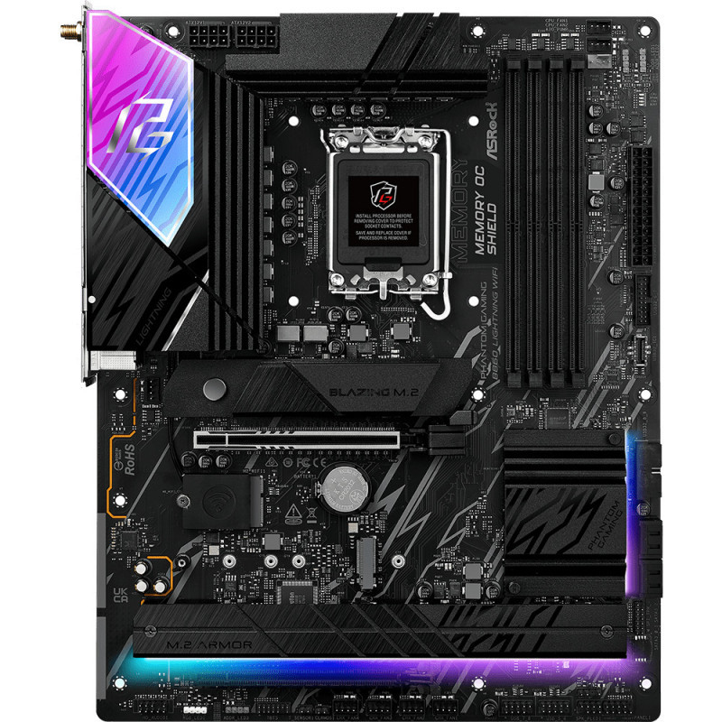 "Asrock B860 Lightning WiFi. Processor manufacturer: Intel, Processor socket: LGA 1851 (Socket V1), Compatible processor series: Intel Core Ultra (Series 2). Supported memory types: DDR5-SDRAM, Maximum internal memory: 256 GB, Memory slots type: DIMM. Supported storage drive interfaces: M.2, SATA III, Supported storage drive types: HDD & SSD, RAID levels: 0, 1, 5, 10. Ethernet interface type: 2.5 Gigabit Ethernet, LAN controller: Killer E3100G, Top Wi-Fi standard: Wi-Fi 6E (802.11ax). Component for: PC, Motherboard form factor: ATX, Motherboard chipset family: Intel"\n"Lightning series stands as a symbol of both speed and power. The design employs linear and angular elements, evoking the imagery of lightning – a spectacle of raw energy and breathtaking speed.