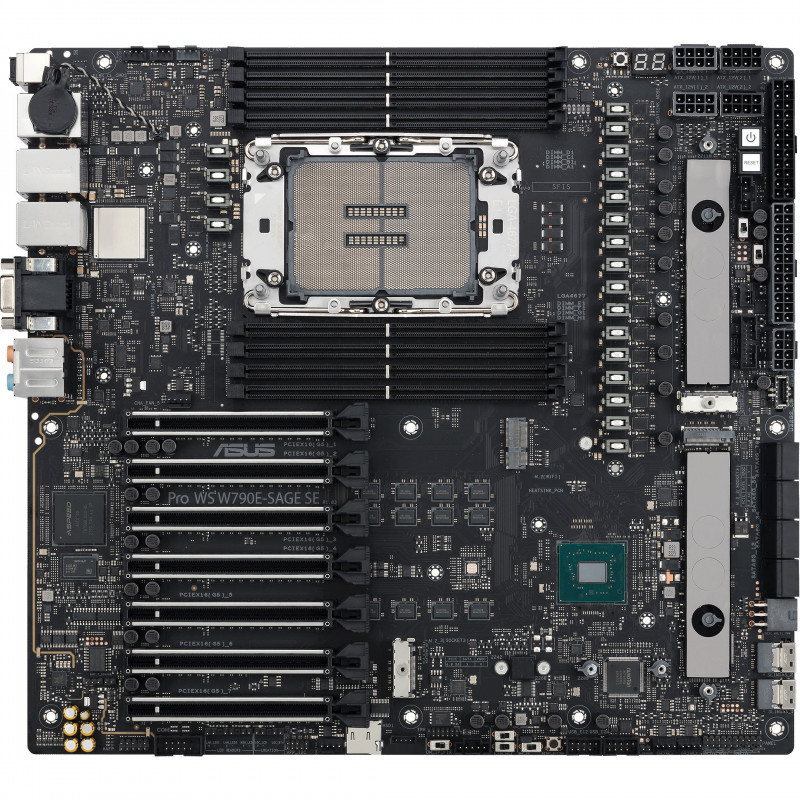 "ASUS PRO WS W790E-SAGE SE. Processor manufacturer: Intel, Processor socket: LGA 4677 (Socket E), Compatible processor series: Intel Xeon W. Supported memory types: DDR5-SDRAM, Maximum internal memory: 2.05 TB, Memory slots type: DIMM. Supported storage drive interfaces: SlimSAS, M.2, SATA III, Supported storage drive types: HDD & SSD, RAID levels: 0, 1, 5, 10. Ethernet interface type: 10 Gigabit Ethernet, Gigabit Ethernet. Component for: Workstation, Motherboard form factor: EEB, Motherboard chipset family: Intel"\n"Performance, Productivity, Proven