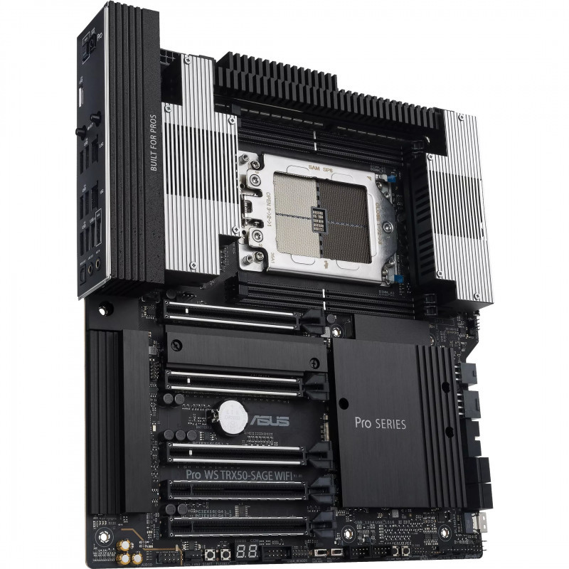 "ASUS Pro WS TRX50-SAGE WIFI. Processor manufacturer: AMD, Processor socket: Socket sTR5, Compatible processor series: AMD Ryzen Threadripper 1000 Series. Supported memory types: DDR5-SDRAM, Maximum internal memory: 1 TB, Memory slots type: DIMM. Supported storage drive interfaces: M.2, SATA III, Supported storage drive types: HDD & SSD, RAID levels: 0, 1, 5, 10. USB connector type: USB Type-A, USB Type-C. Ethernet interface type: 2.5 Gigabit Ethernet, 10 Gigabit Ethernet, LAN controller: Intel I226-LM, Top Wi-Fi standard: Wi-Fi 7 (802.11be)"\n"A WORKSTATION WONDERLAND