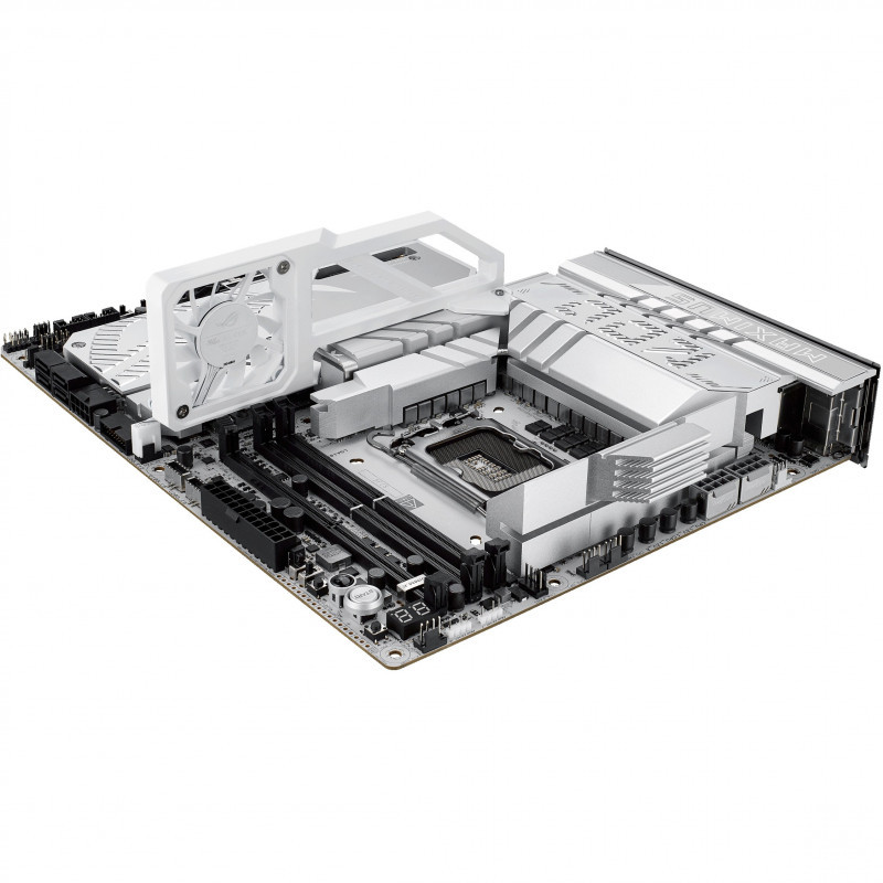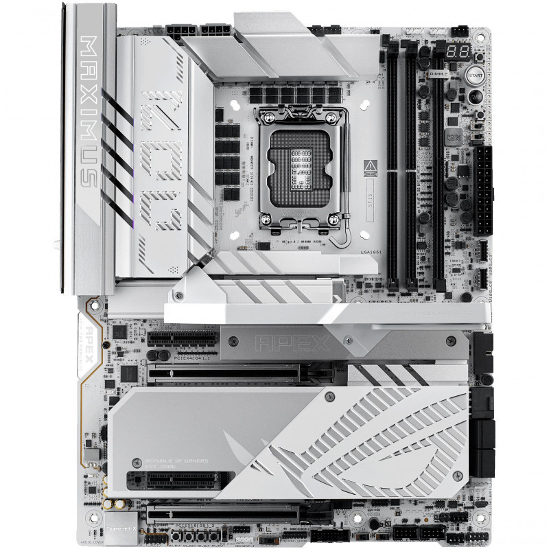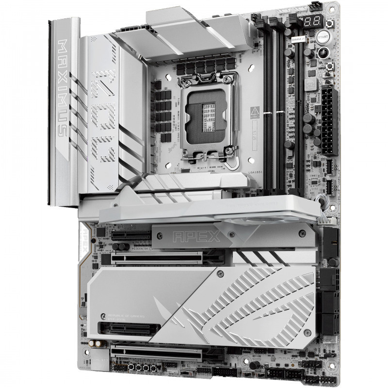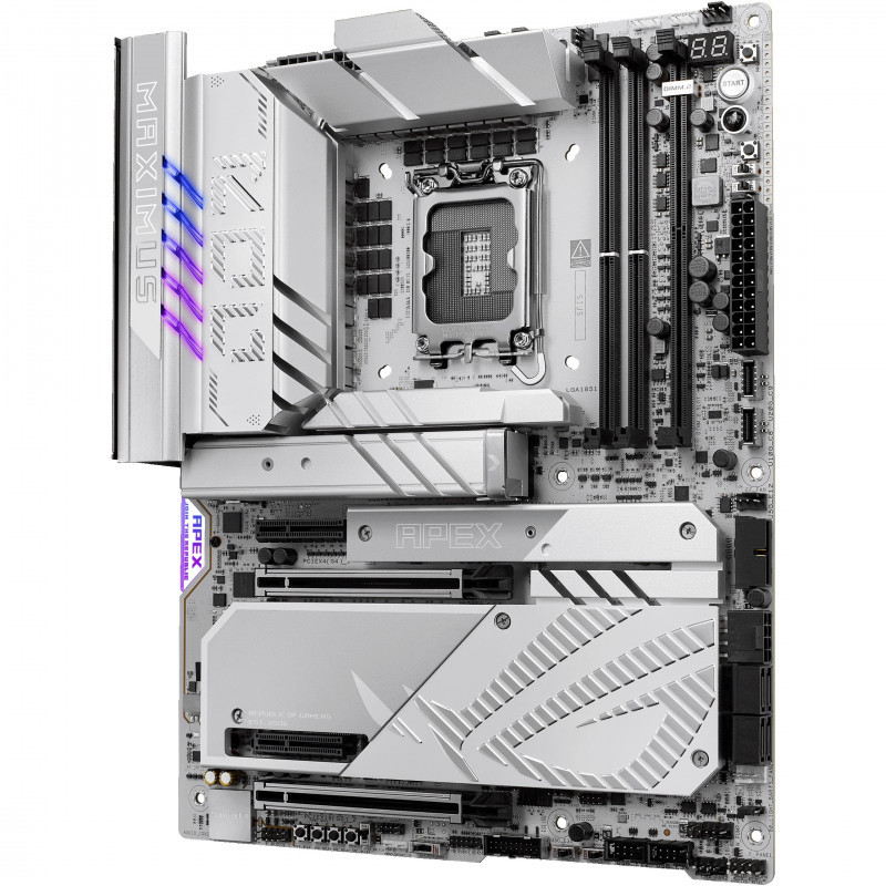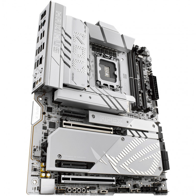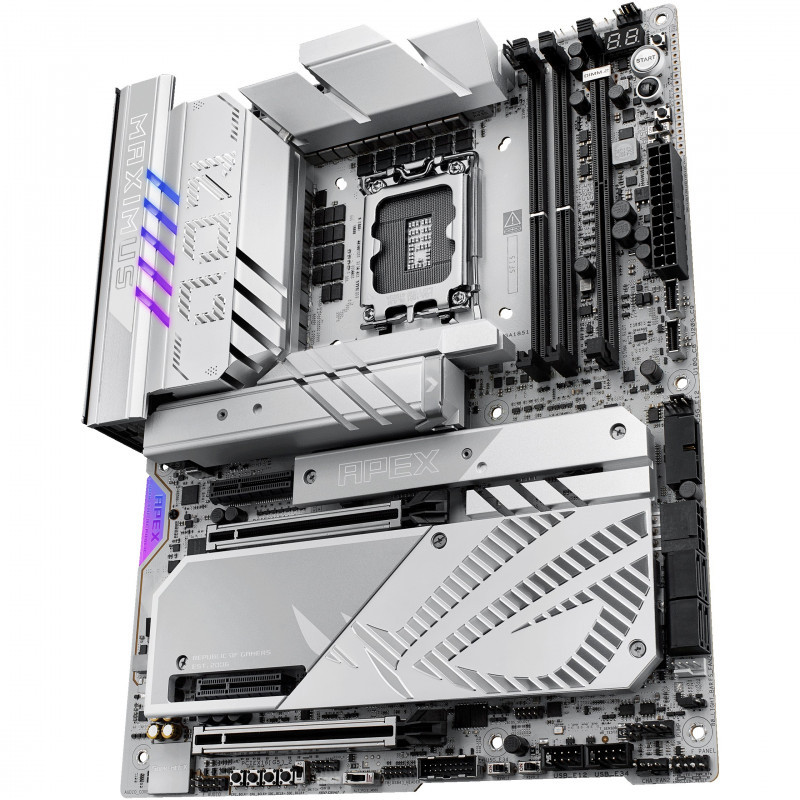 The ROG Maximus Z890 Apex fully supports Intel® Core™ Ultra processors (Series 2). Precision-engineered for supreme overclocking, it carries the legacy of the series forward into a new generation. With exceptional power delivery and a two-slot DDR5 memory layout, overclockers can meet and exceed their ambitions for record-breaking CPU and memory performance. For those who favor lighter colors for the aesthetics of their build, the ROG Maximus Z890 Apex features a cobble-gray surface, polished metallic accents, sleek contours and a predominantly silver palette."