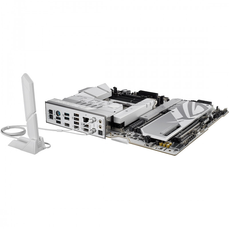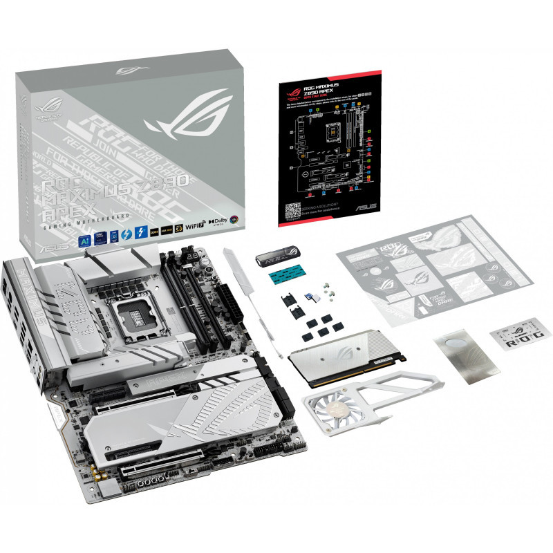 "ASUS ROG MAXIMUS Z890 APEX. Processor manufacturer: Intel, Processor socket: LGA 1851 (Socket V1), Compatible processor series: Intel Core Ultra (Series 2). Supported memory types: DDR5-SDRAM, Maximum internal memory: 96 GB, Memory slots type: DIMM. Supported storage drive interfaces: M.2, SATA III, Supported storage drive types: HDD & SSD, RAID levels: 0, 1, 5, 10. Ethernet interface type: 5 Gigabit Ethernet, Top Wi-Fi standard: Wi-Fi 7 (802.11be), Wi-Fi standards: Wi-Fi 7 (802.11be). Component for: PC, Motherboard form factor: ATX, Motherboard chipset family: Intel"\n"ROG Maximus Z890 APEX