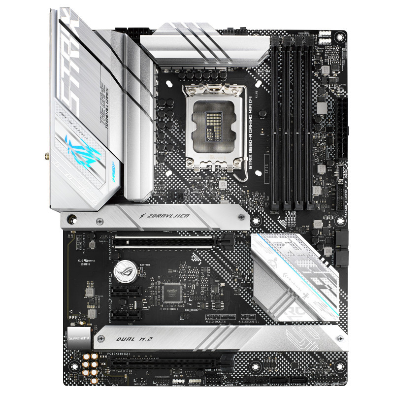 The ROG Strix B660-A Gaming WiFi D4 will turn heads with a striking silver-white finish that contrasts with a bold Aura RGB-illuminated glitch-effect logo. Meanwhile, parallel strakes and dotted text on the aluminum I/O shroud, M.2 and PCH heatsinks tie the whole aesthetic together and underline the ROG Strix fundamentals of speed, diversity and attitude.