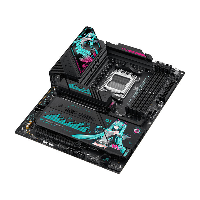 "ASUS ROG STRIX X870E-H GAMING WIFI7 HATSUNE MIKU EDITION. Processor manufacturer: AMD, Processor socket: Socket AM5, Compatible processor series: AMD Ryzen 7000 Series, AMD Ryzen 8000 Series, AMD Ryzen 9000 Series. Supported memory types: DDR5-SDRAM, Maximum internal memory: 256 GB, Memory channels: Dual-channel. Supported storage drive interfaces: M.2, SATA III, Supported storage drive types: HDD & SSD, RAID levels: 0, 1, 5, 10. Ethernet interface type: 5 Gigabit Ethernet, Top Wi-Fi standard: Wi-Fi 7 (802.11be), Wi-Fi standards: Wi-Fi 7 (802.11be). Component for: PC, Motherboard form factor: ATX, Motherboard chipset family: AMD"\n"Feel the Beat,