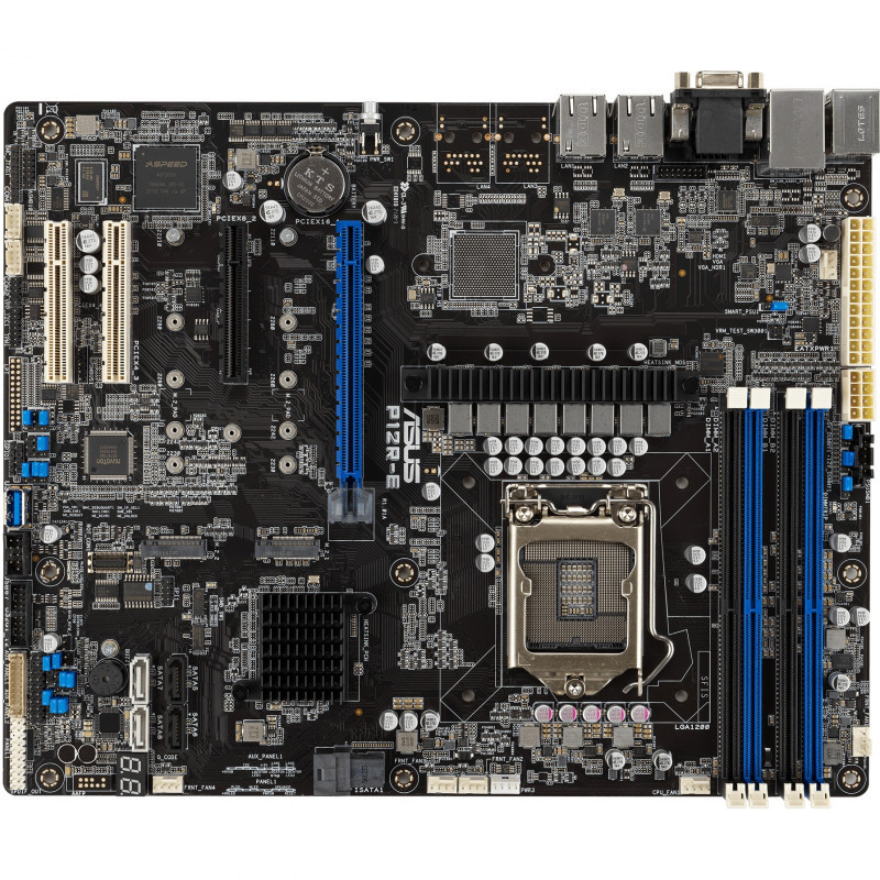 "ASUS P12R-E. Processor manufacturer: Intel, Processor socket: LGA 1200 (Socket H5), Compatible processor series: Intel® Pentium®, Intel Xeon E. Supported memory types: DDR4-SDRAM, Maximum internal memory: 128 GB, Memory slots type: DIMM. Supported storage drive interfaces: M.2, SATA III, Supported storage drive types: HDD & SSD. Graphics card family: ASPEED, On-board graphics card model: Aspeed AST2600, On-board graphics card memory: 64 MB. Ethernet interface type: Gigabit Ethernet"\n"PCIe 4.0 Ready