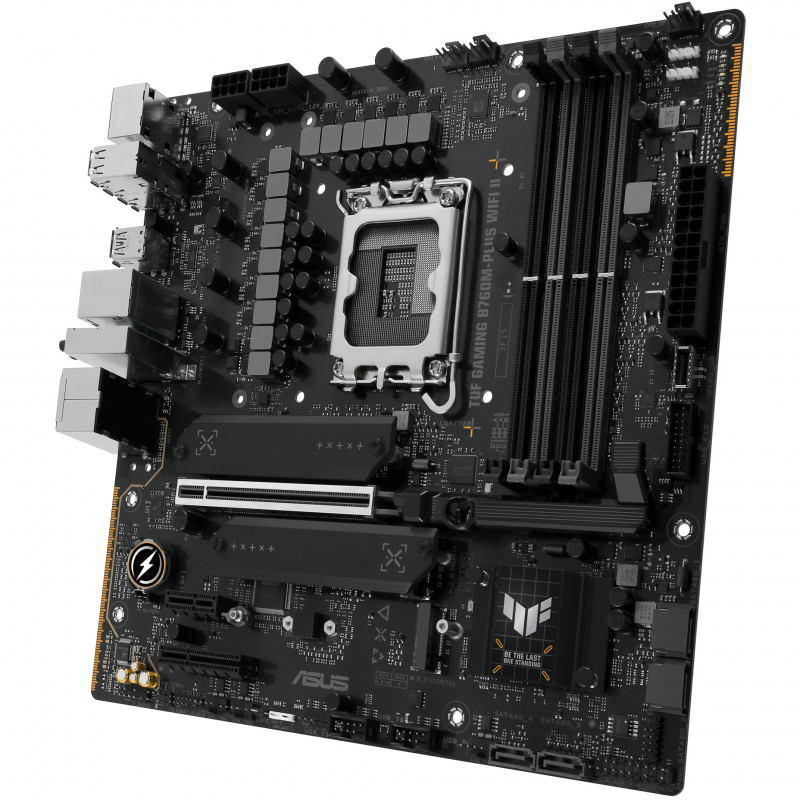 "ASUS TUF GAMING B760M-PLUS WIFI II. Processor manufacturer: Intel, Processor socket: LGA 1700, Compatible processor series: Intel® Celeron®, Intel® Core™ i3, Intel® Core™ i5, Intel® Core™ i7, Intel® Core™ i9,.... Supported memory types: DDR5-SDRAM, Maximum internal memory: 192 GB, Memory slots type: DIMM. Supported storage drive interfaces: M.2, SATA III, Supported storage drive types: HDD & SSD, RAID levels: 0, 1, 5, 10. Ethernet interface type: 2.5 Gigabit Ethernet, Top Wi-Fi standard: Wi-Fi 6E (802.11ax), Wi-Fi standards: Wi-Fi 6E (802.11ax). Component for: PC, Motherboard form factor: micro ATX, Motherboard chipset family: Intel"\n"TUF GAMING B760M-PLUS WIFI II takes all the essential elements of the latest Intel® processors and combines them with game-ready features and proven durability. Engineered with military-grade components, an upgraded power solution and a comprehensive cooling system, this motherboard goes beyond expectations with rock-solid performance for marathon gaming. TUF GAMING motherboards also undergo rigorous endurance testing to ensure that they can handle conditions where others may fail. Aesthetically, this model incorporates an embossed nameplate and geometric design elements to reflect the dependability and stability that defines the TUF GAMING series.