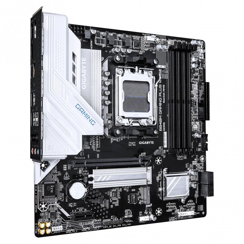 "GIGABYTE B840M GAMING PLUS WIFI6E Motherboard - AMD Ryzen 9000 CPUs, 8+2+2 Phases VRM, up to 8200MHz DDR5(O.C), 2xPCIe 4.0 M.2, Wi-Fi 6E, 1GbE LAN, USB 3.2 Gen 2. Processor manufacturer: AMD, Processor socket: Socket AM5, Compatible processor series: AMD Ryzen 7000 Series, AMD Ryzen 8000 Series, AMD Ryzen 9000 Series. Supported memory types: DDR5-SDRAM, Maximum internal memory: 256 GB, Memory slots type: DIMM. Supported storage drive interfaces: M.2, PCI Express 4.0, SATA III, Supported storage drive types: HDD & SSD, RAID levels: 0, 1, 10, 5. Maximum resolution: 4096 x 2160 pixels. Ethernet interface type: Gigabit Ethernet, LAN controller: Realtek RTL8111H, Top Wi-Fi standard: Wi-Fi 6E (802.11ax)"\n"Elevate your computing experience with GIGABYTE's renowned motherboard series: AORUS, AERO, and GIGABYTE. Featuring innovative designs and advanced features, these boards offer exceptional performance and reliability. Whether you're a gamer, content creator, or professional, our series cater to your needs, ensuring uncompromising quality and cutting-edge technology."