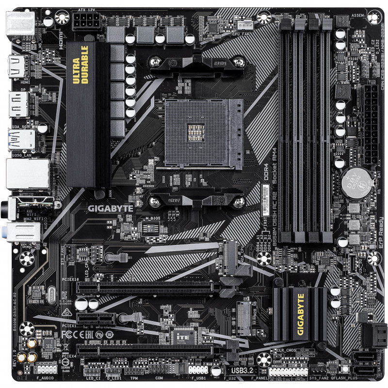 "GIGABYTE B550M DS3H AC R2 Motherboard - AMD Ryzen 5000 CPUs, 5+3 Phases VRM, up to 4733MHz DDR4 (O.C.), 1xPCIe 4.0 + 1xPCIe 3.0 M.2, Wi-Fi 5, 1GbE LAN, USB 3.2 Gen 1. Processor manufacturer: AMD, Processor socket: Socket AM4, Compatible processor series: AMD Ryzen 3000 Series, AMD Ryzen 4000 Series, AMD Ryzen 5000 Series. Supported memory types: DDR4-SDRAM, Maximum internal memory: 128 GB, Memory slots type: DIMM. Supported storage drive interfaces: M.2, PCI Express 3.0, PCI Express 4.0, SATA III, Supported storage drive types: HDD & SSD, RAID levels: 0, 1, 10. Maximum resolution: 5120 x 2880 pixels. Ethernet interface type: Gigabit Ethernet, LAN controller: Realtek RTL8111H, Top Wi-Fi standard: Wi-Fi 5 (802.11ac)"\n"Elevate your computing experience with GIGABYTE's renowned motherboard series: AORUS, AERO, and GIGABYTE. Featuring innovative designs and advanced features, these boards offer exceptional performance and reliability. Whether you're a gamer, content creator, or professional, our series cater to your needs, ensuring uncompromising quality and cutting-edge"